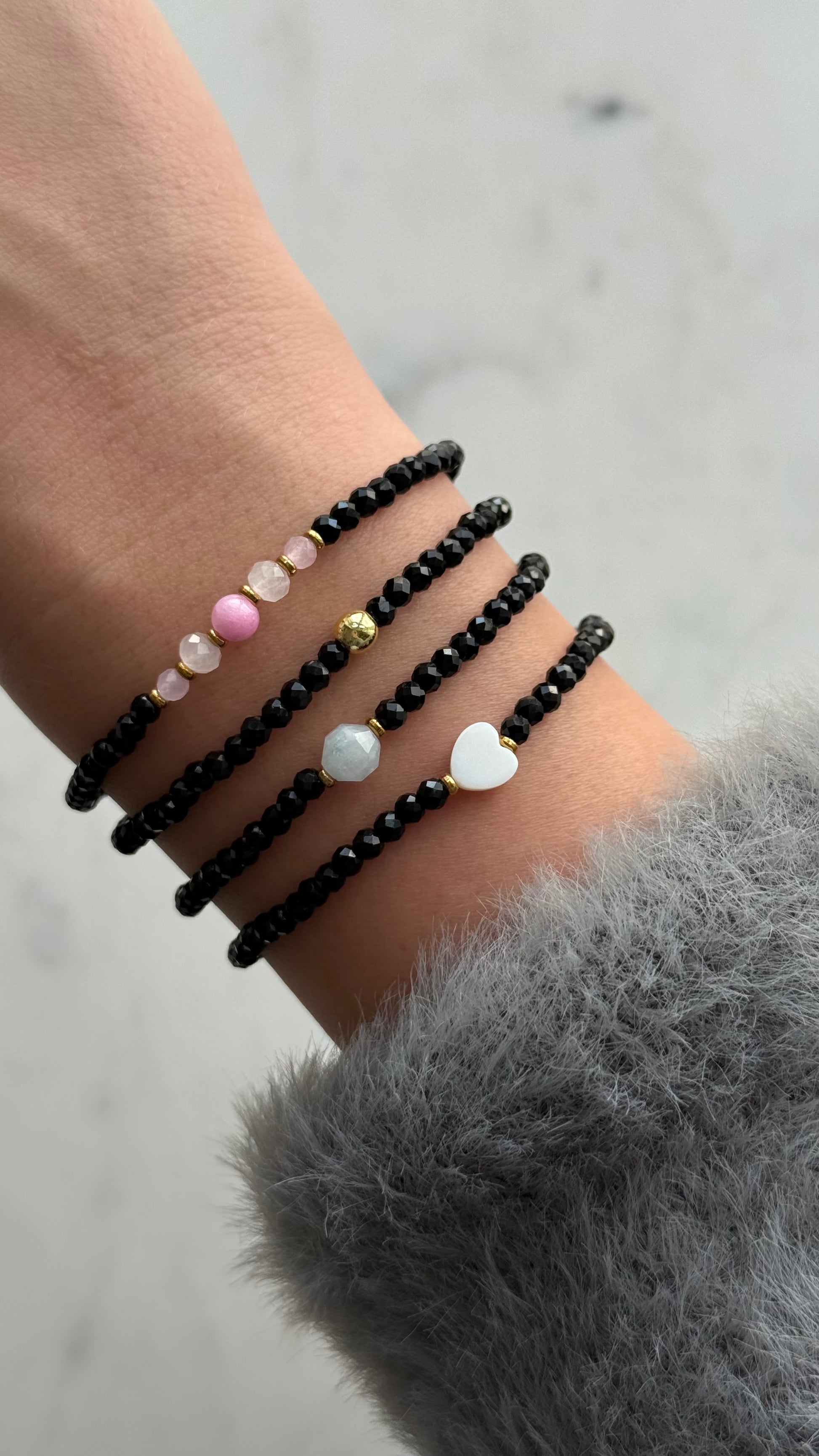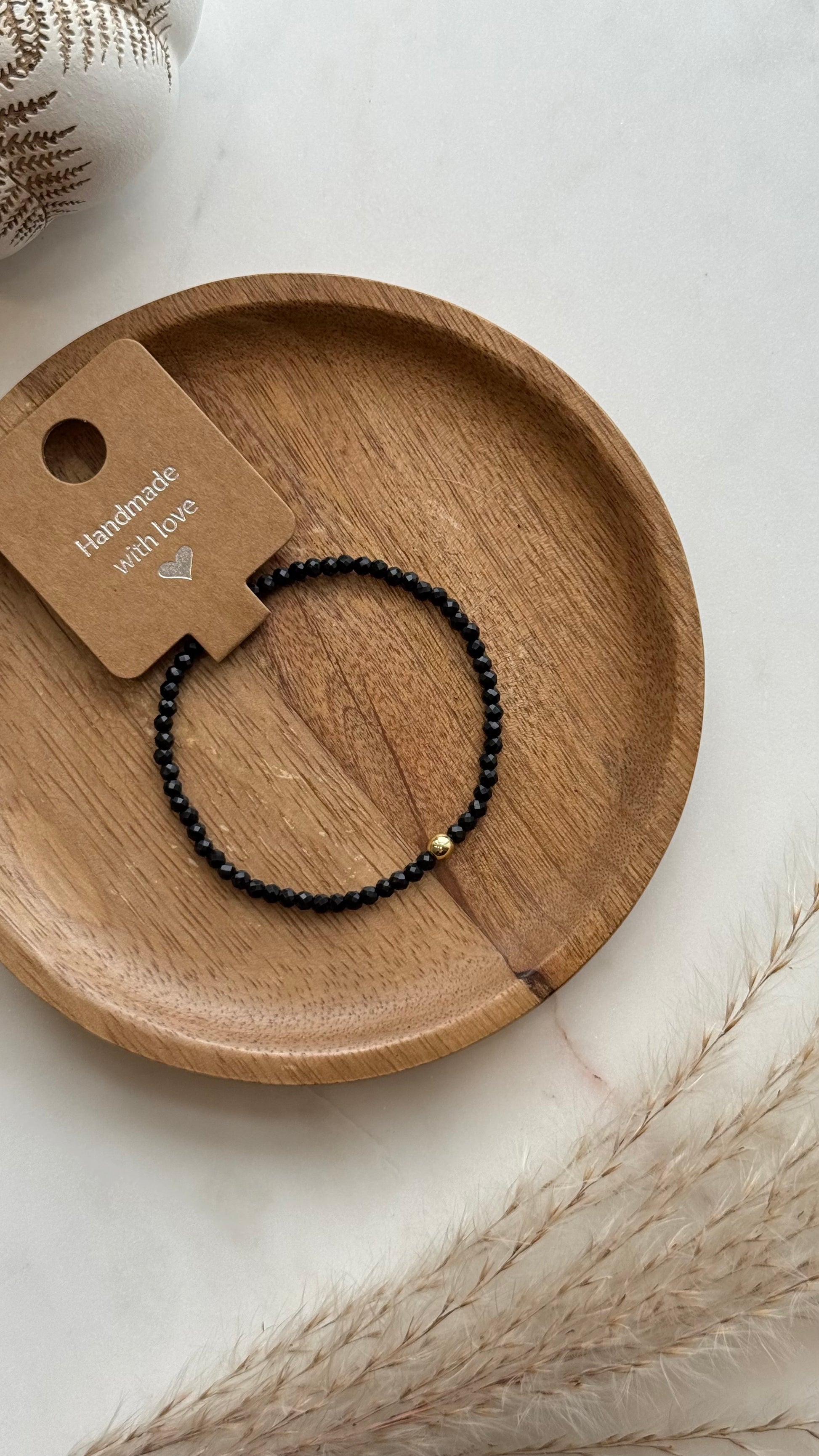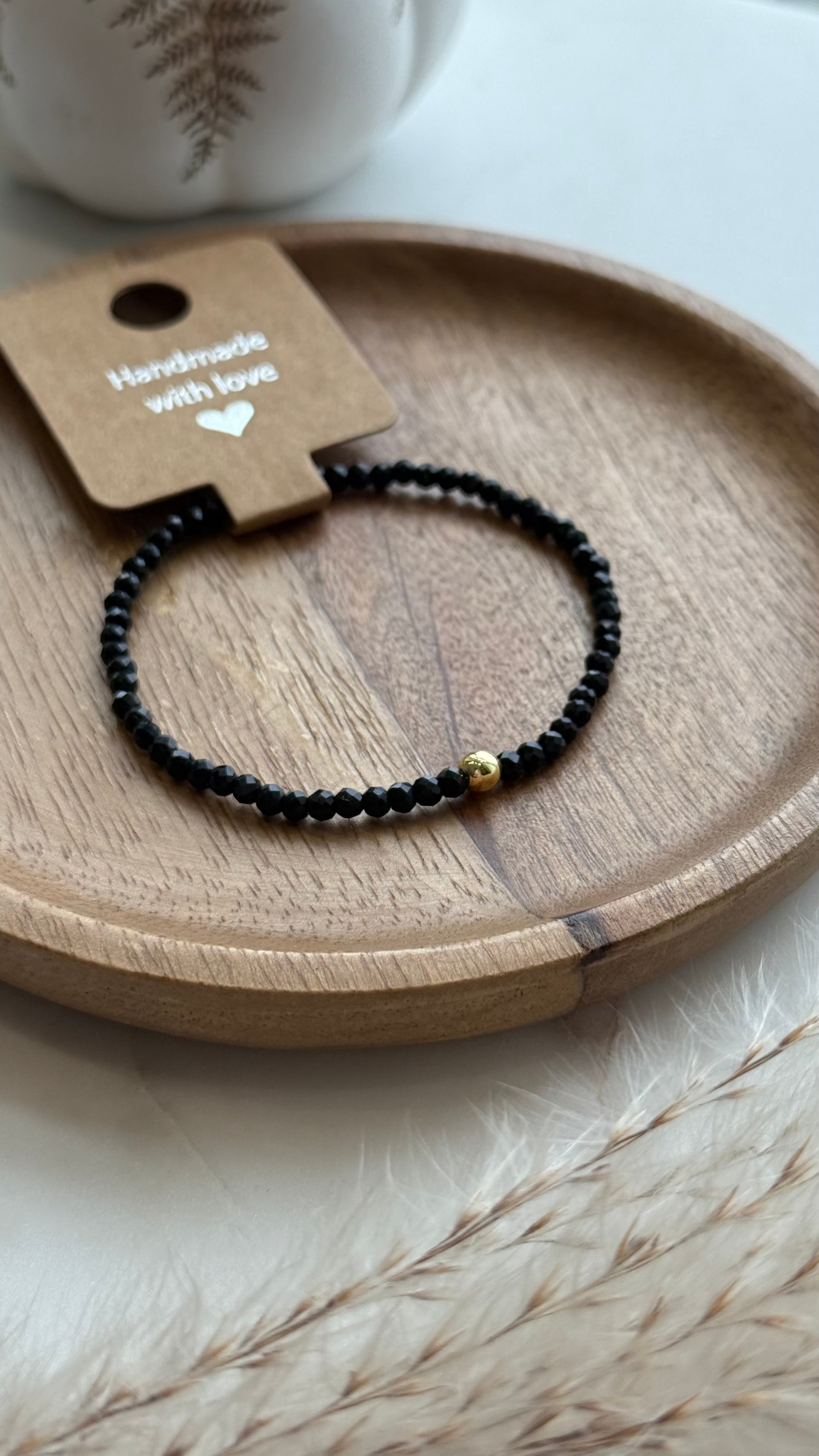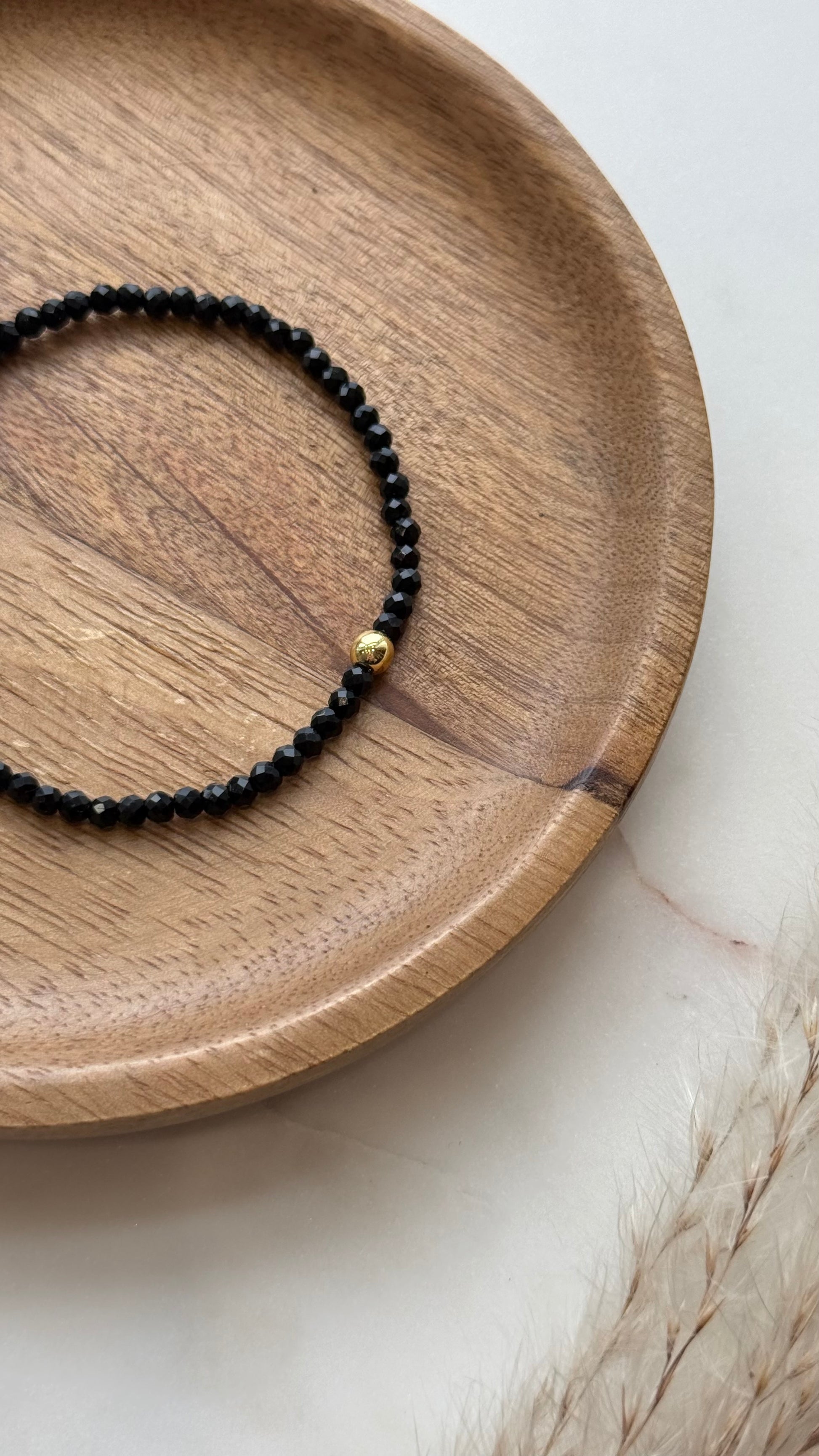 Bransoletka z czarnego turmalinu i kuleczki w kolorze złotym.