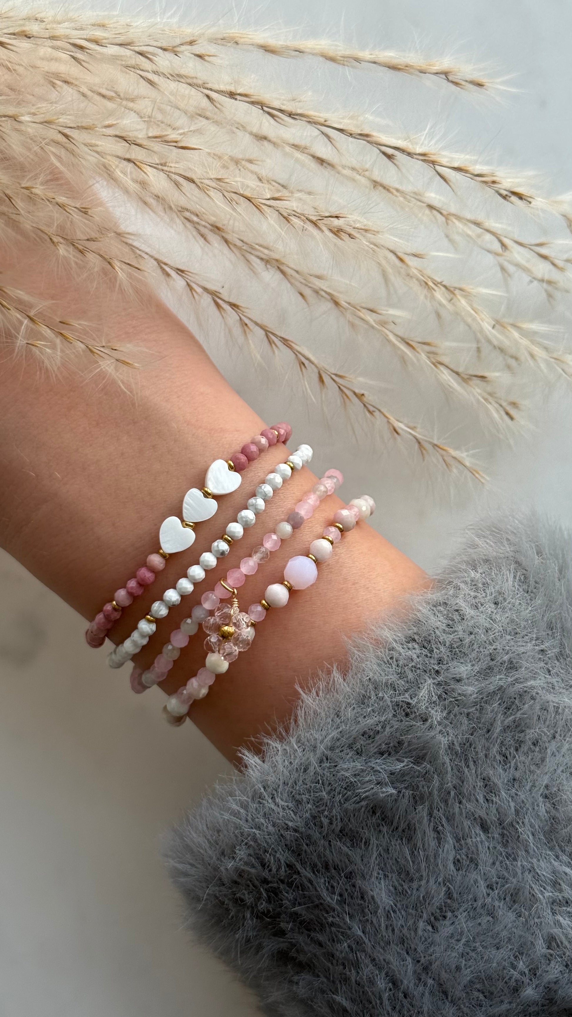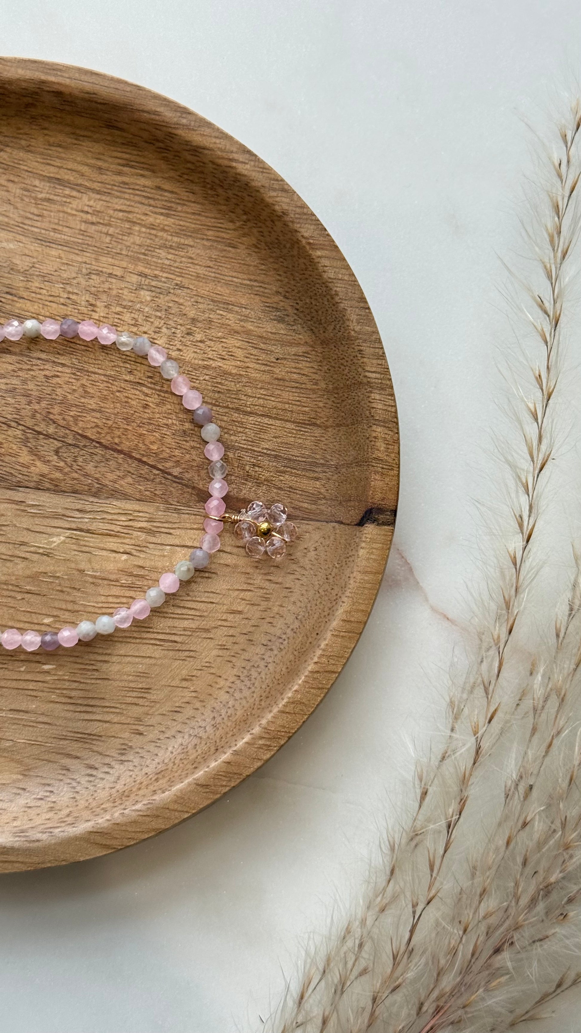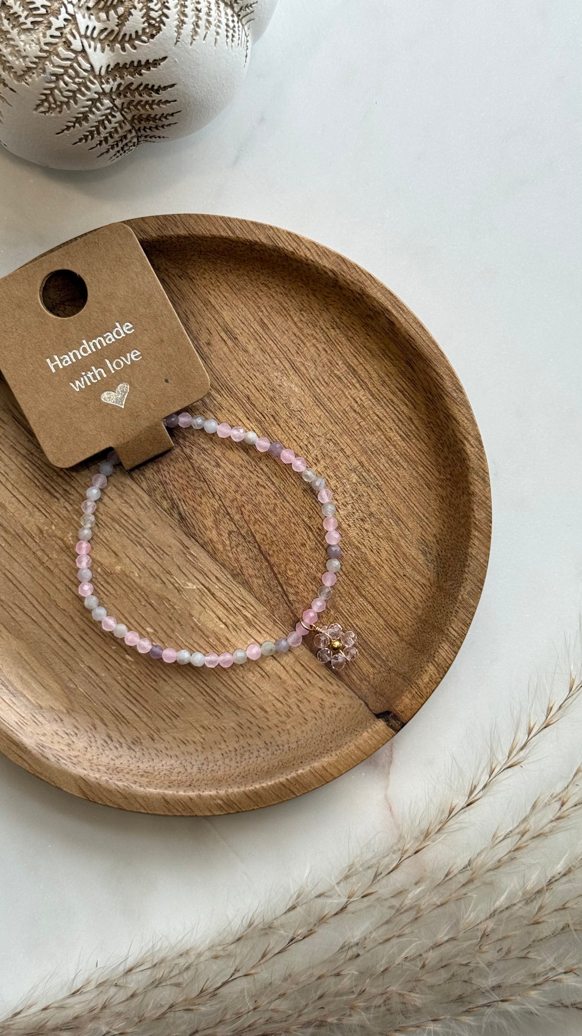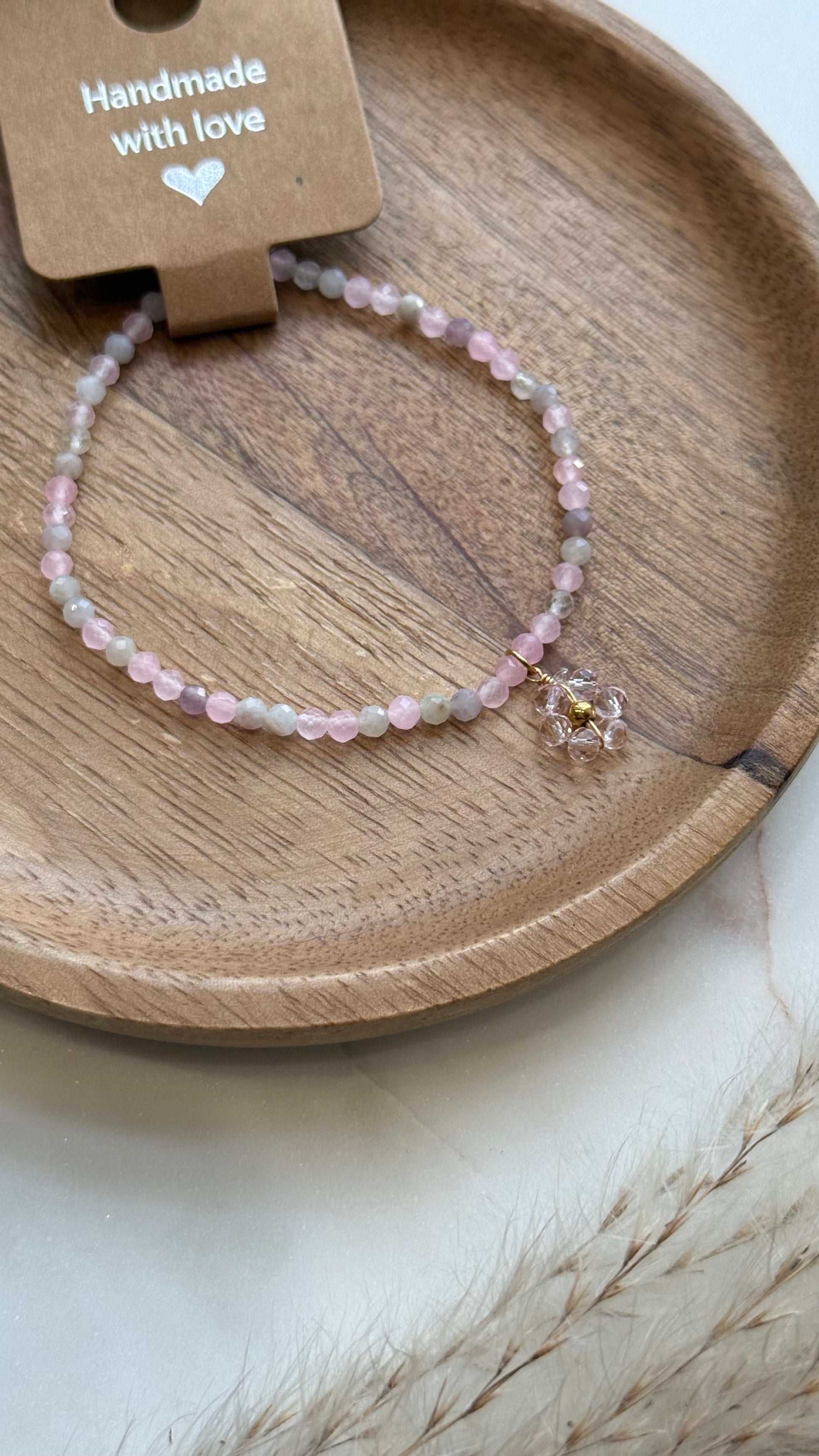 Bransoletka z turmalinu i zawieszki w kształcie kwiatuszka. Błysk różu połączony z miękkością naturalnych kamieni.