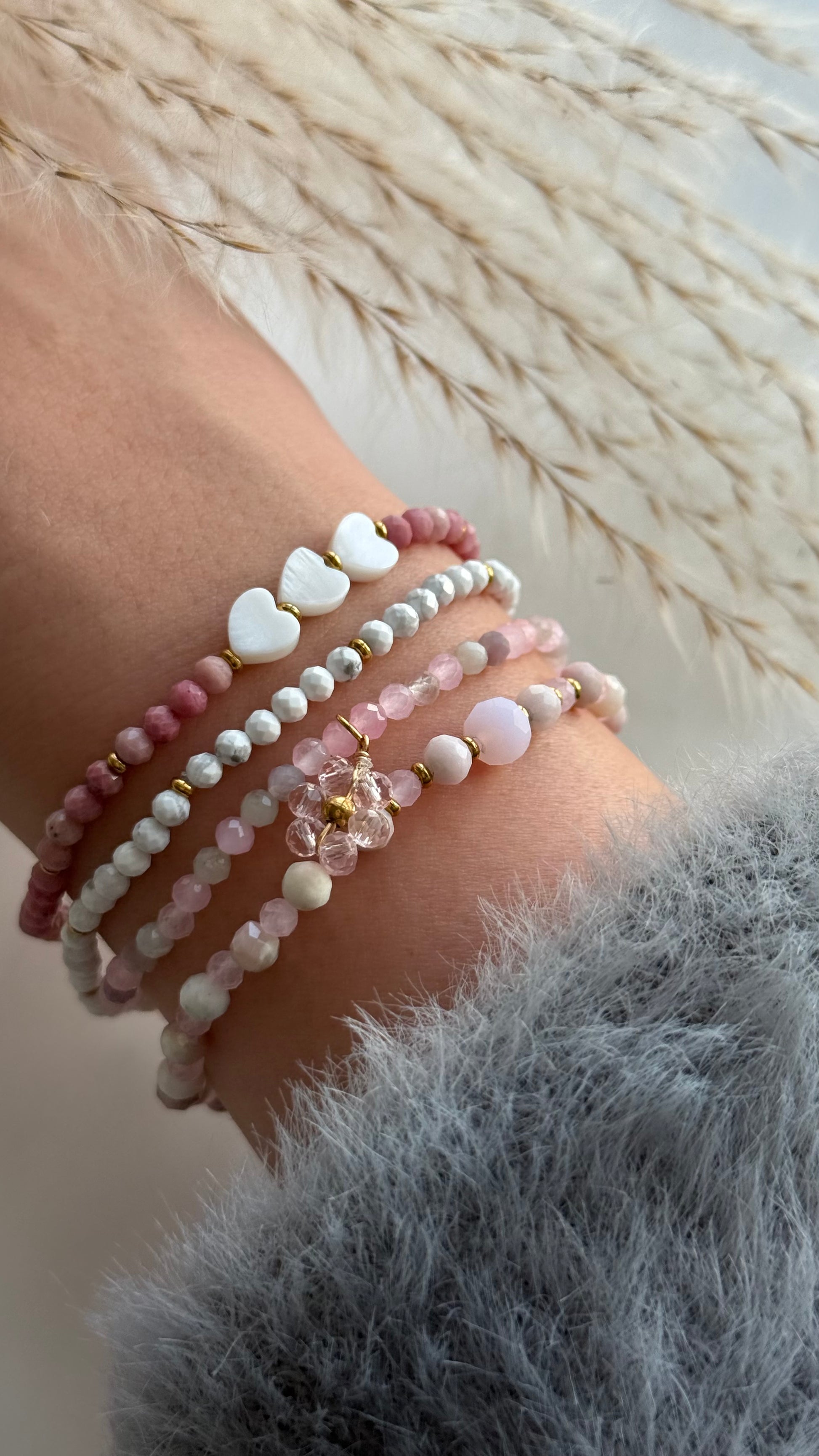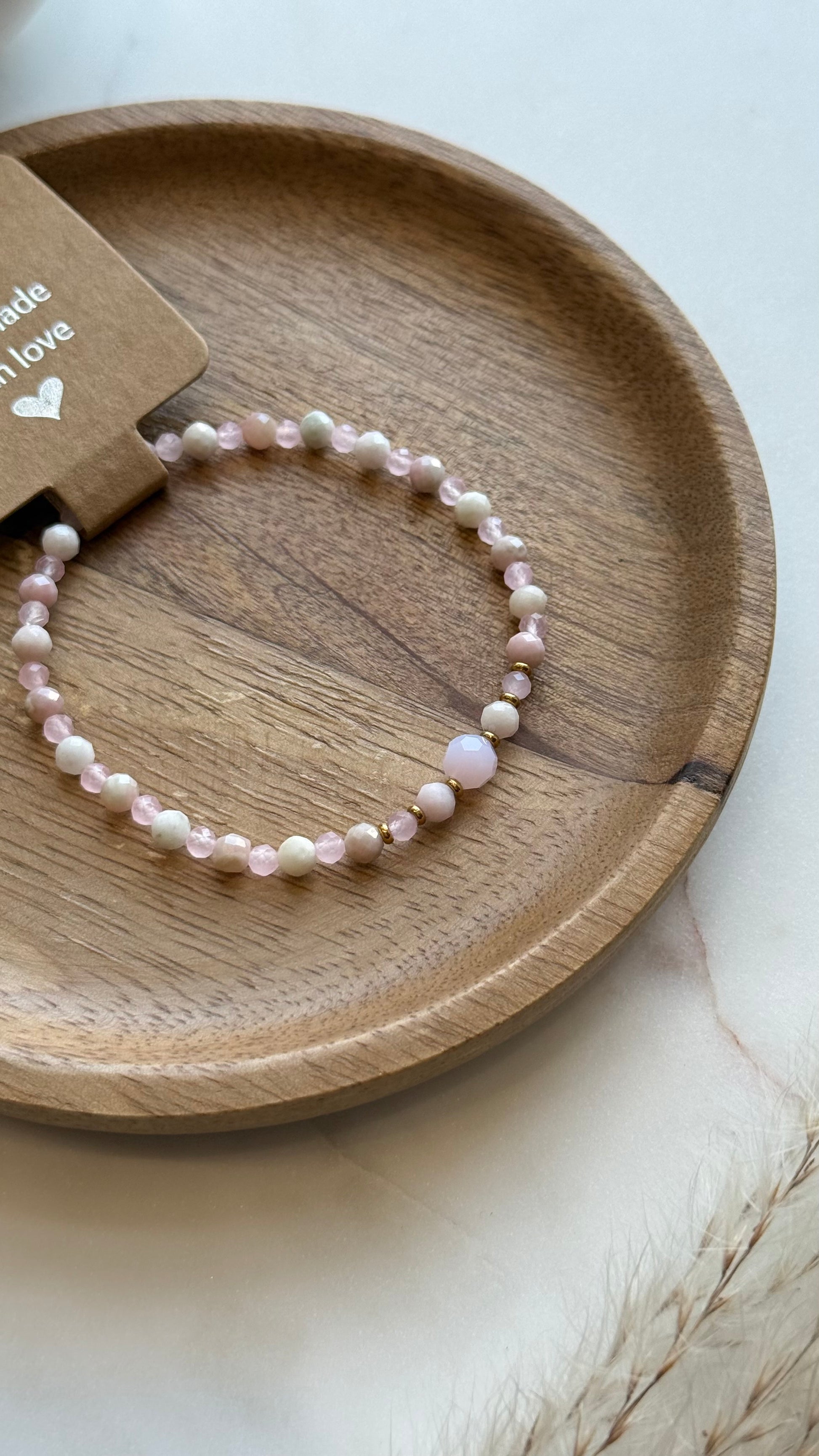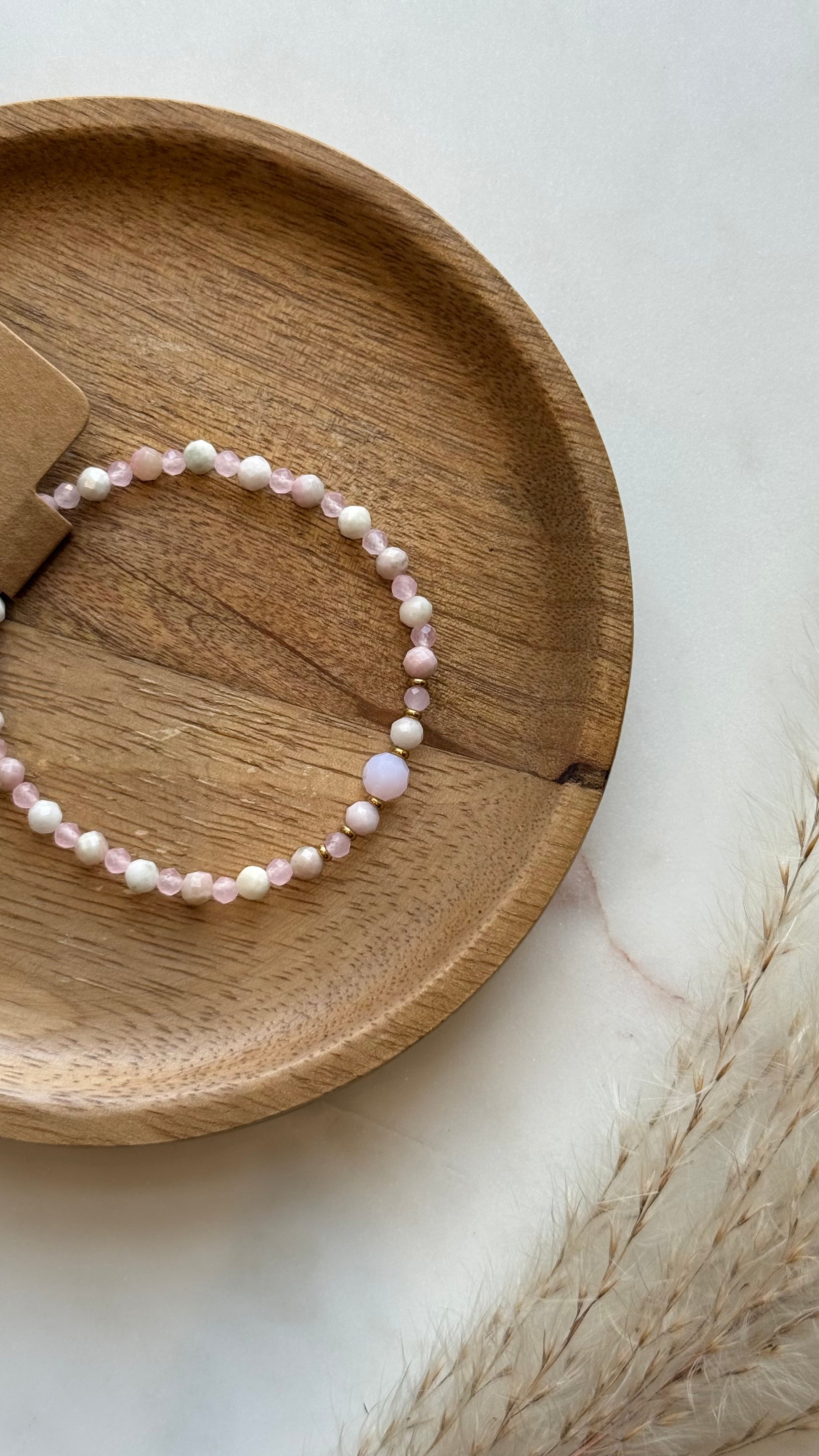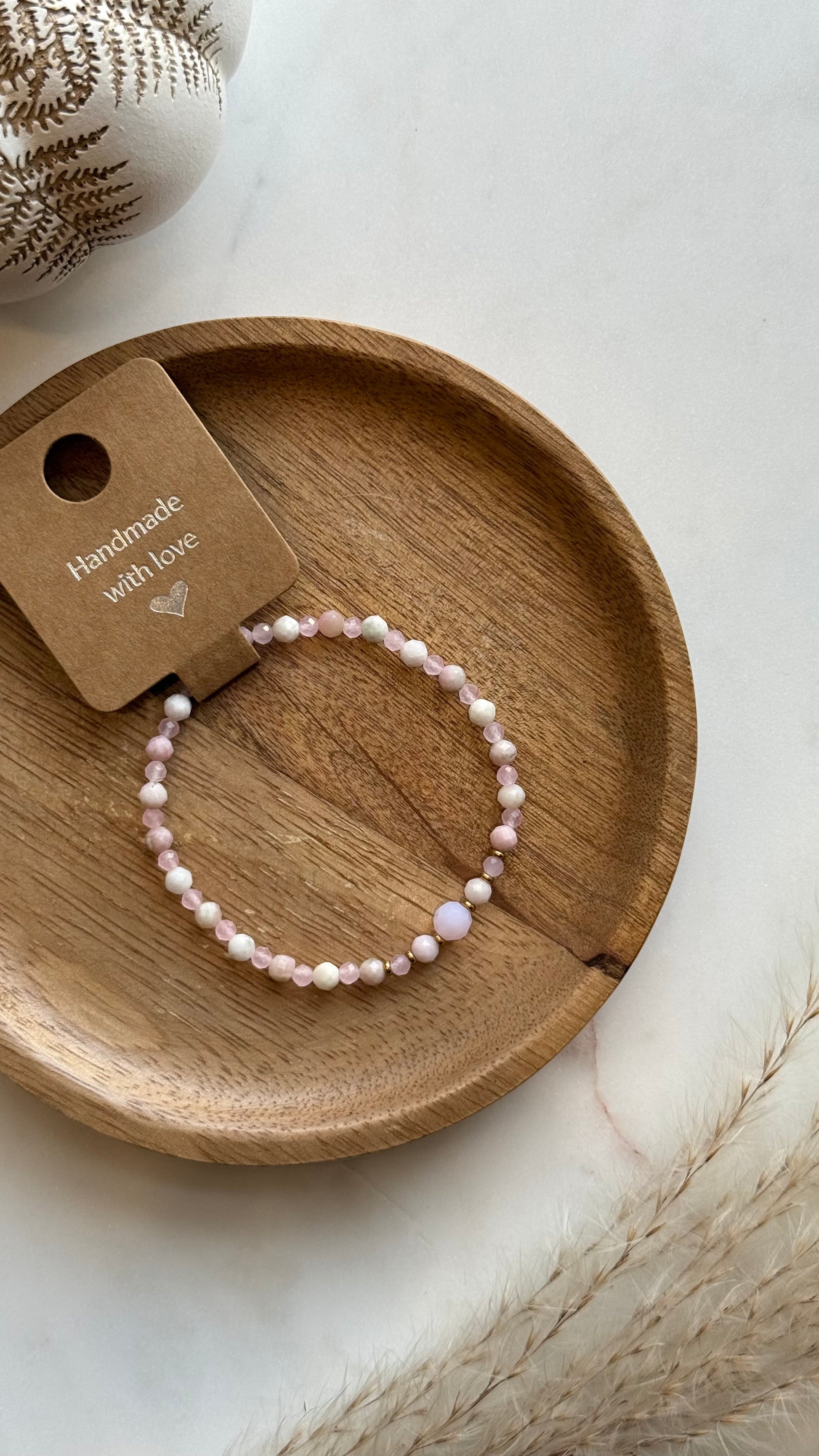 Bransoletka z różowego opalu, kwarcu i masy perłowej.