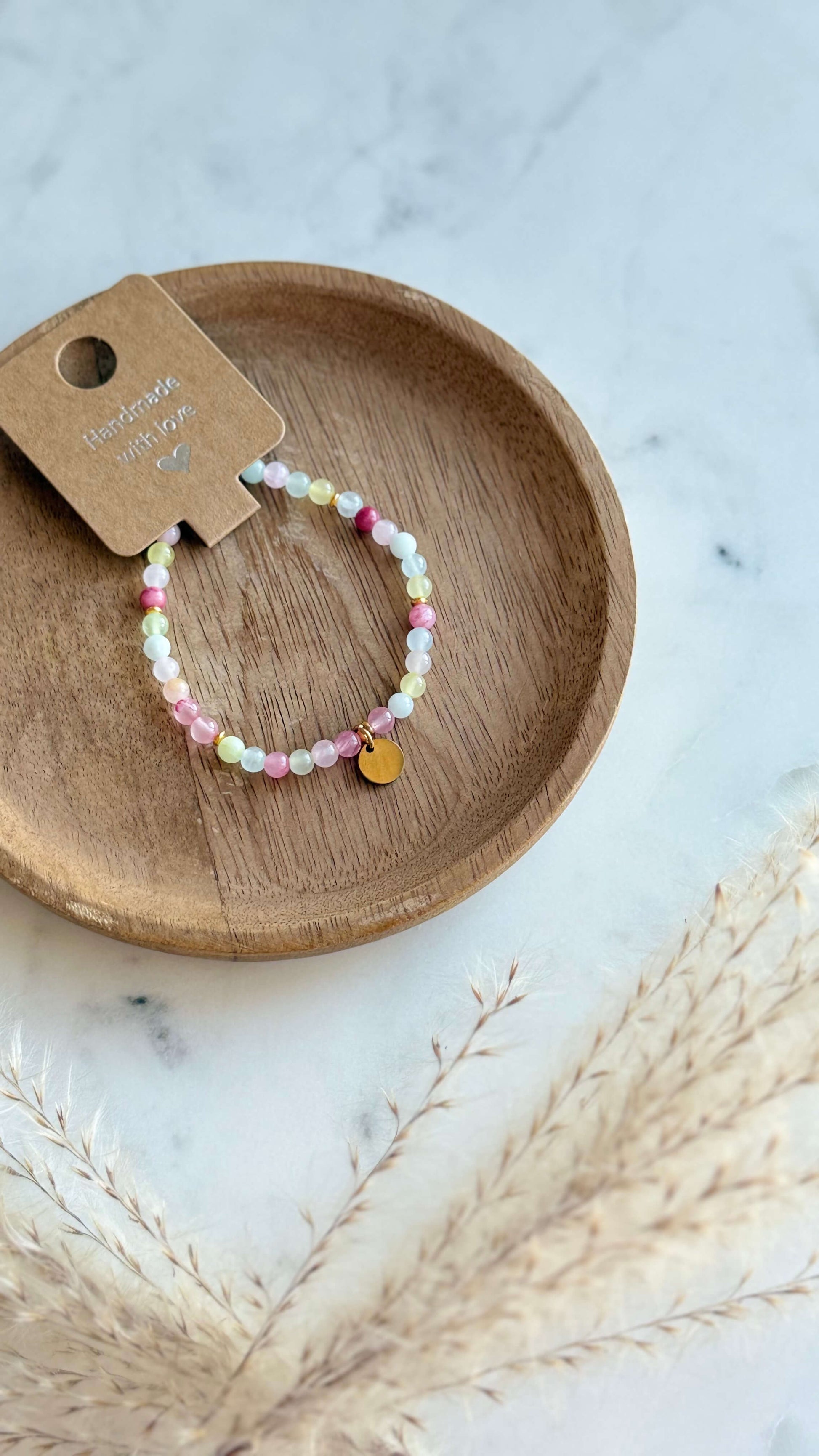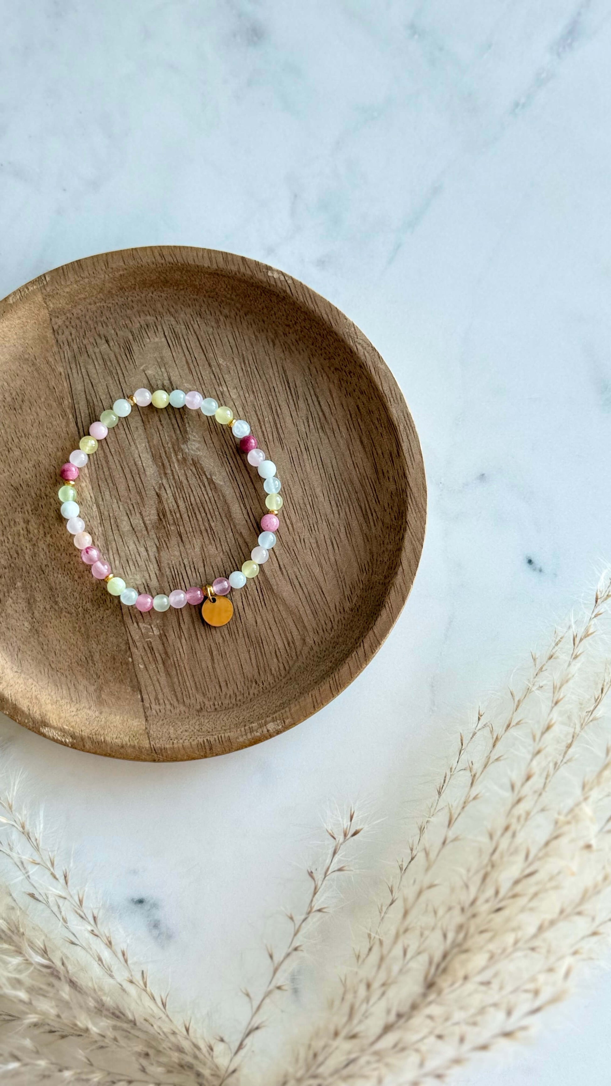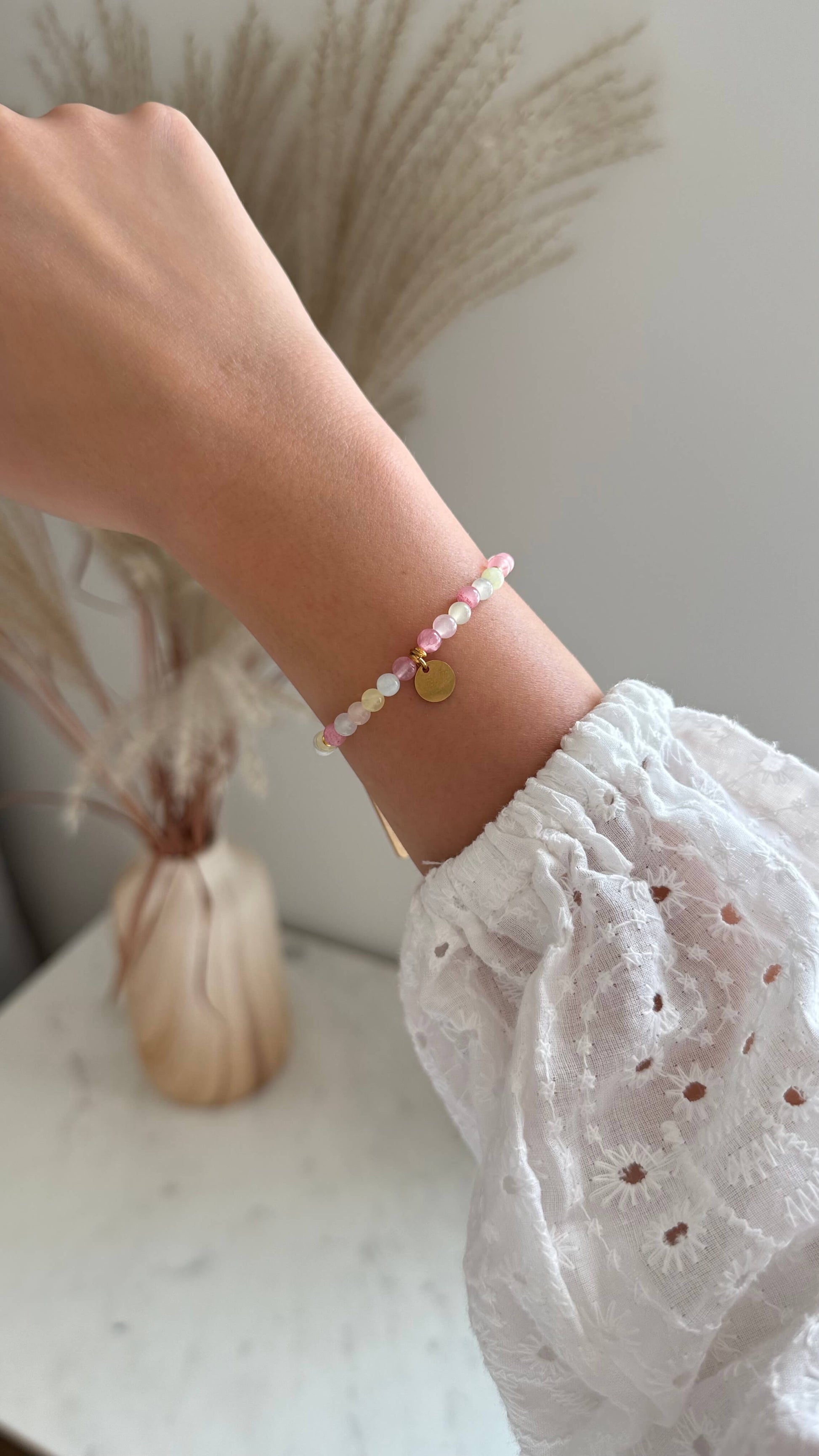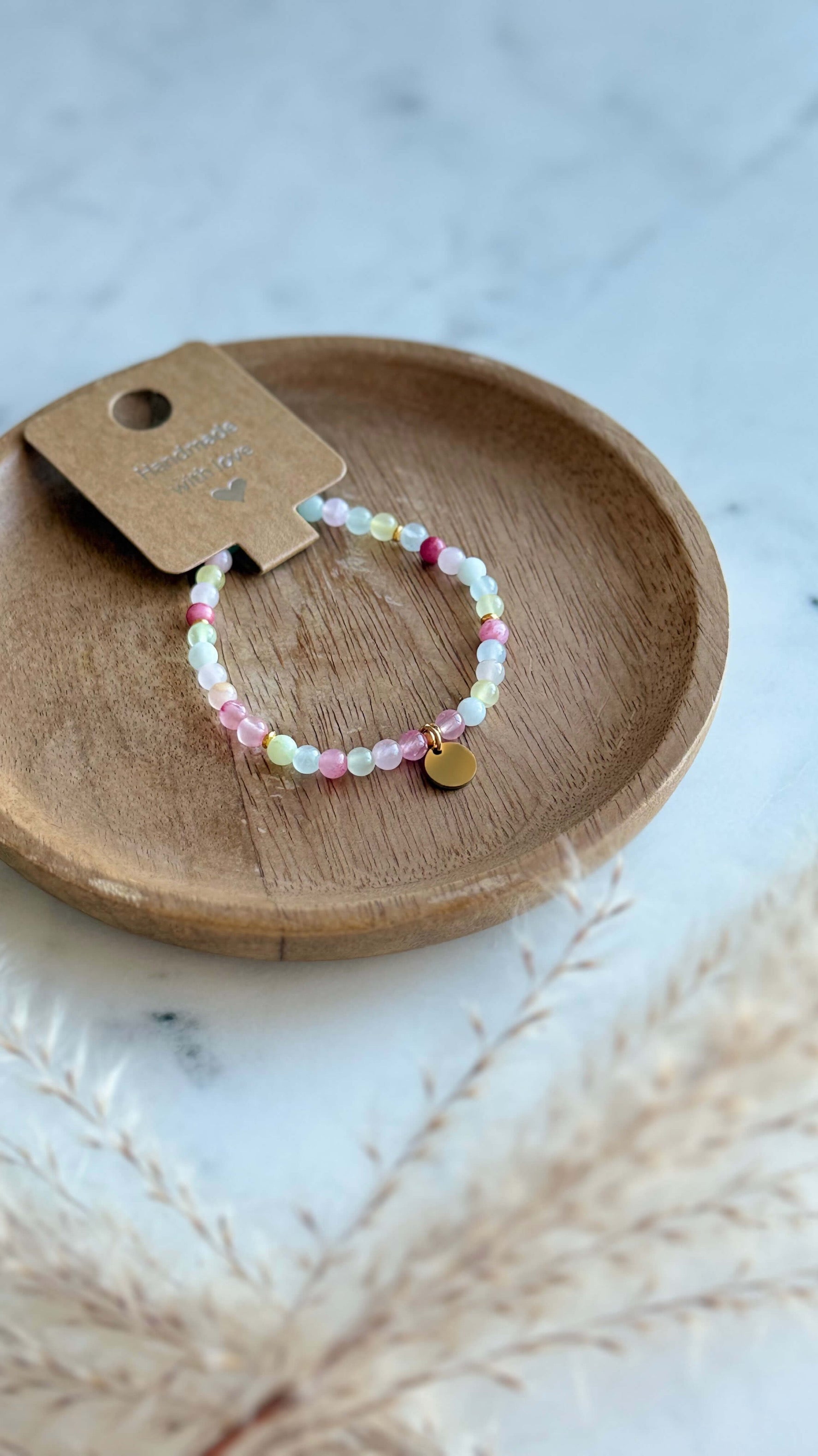 Bransoletka z pastelowych kamieni naturalnych i złotym kółeczkiem.
