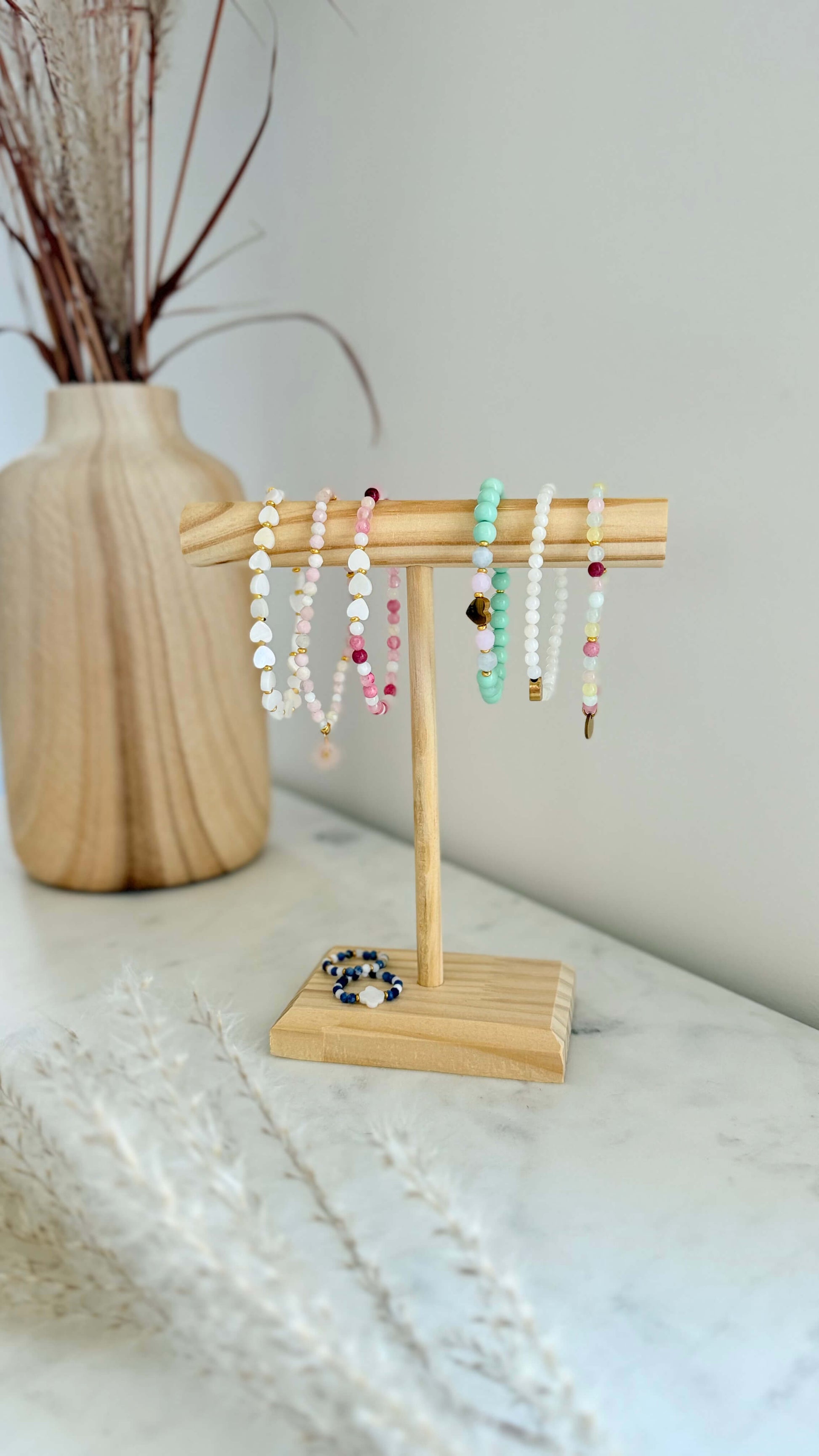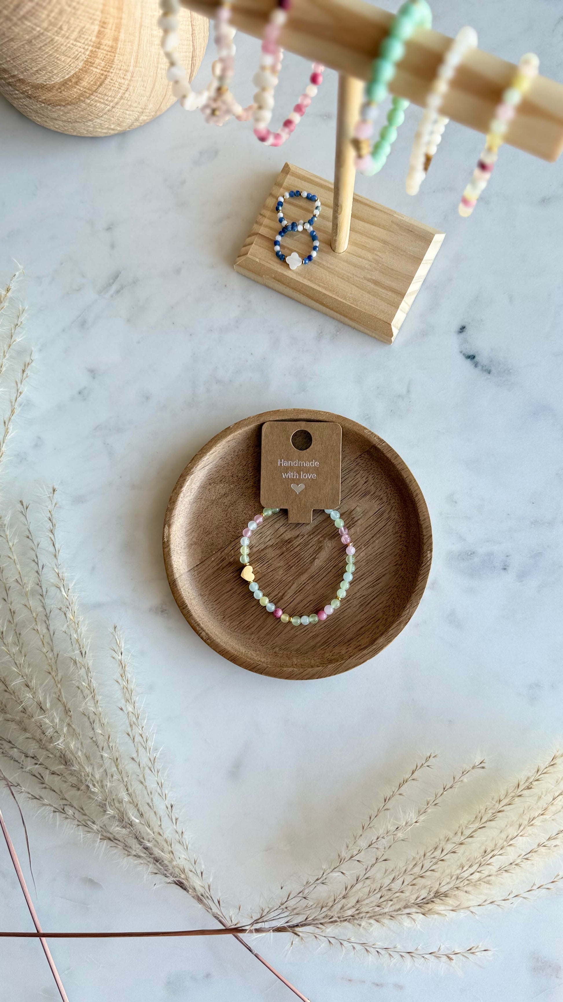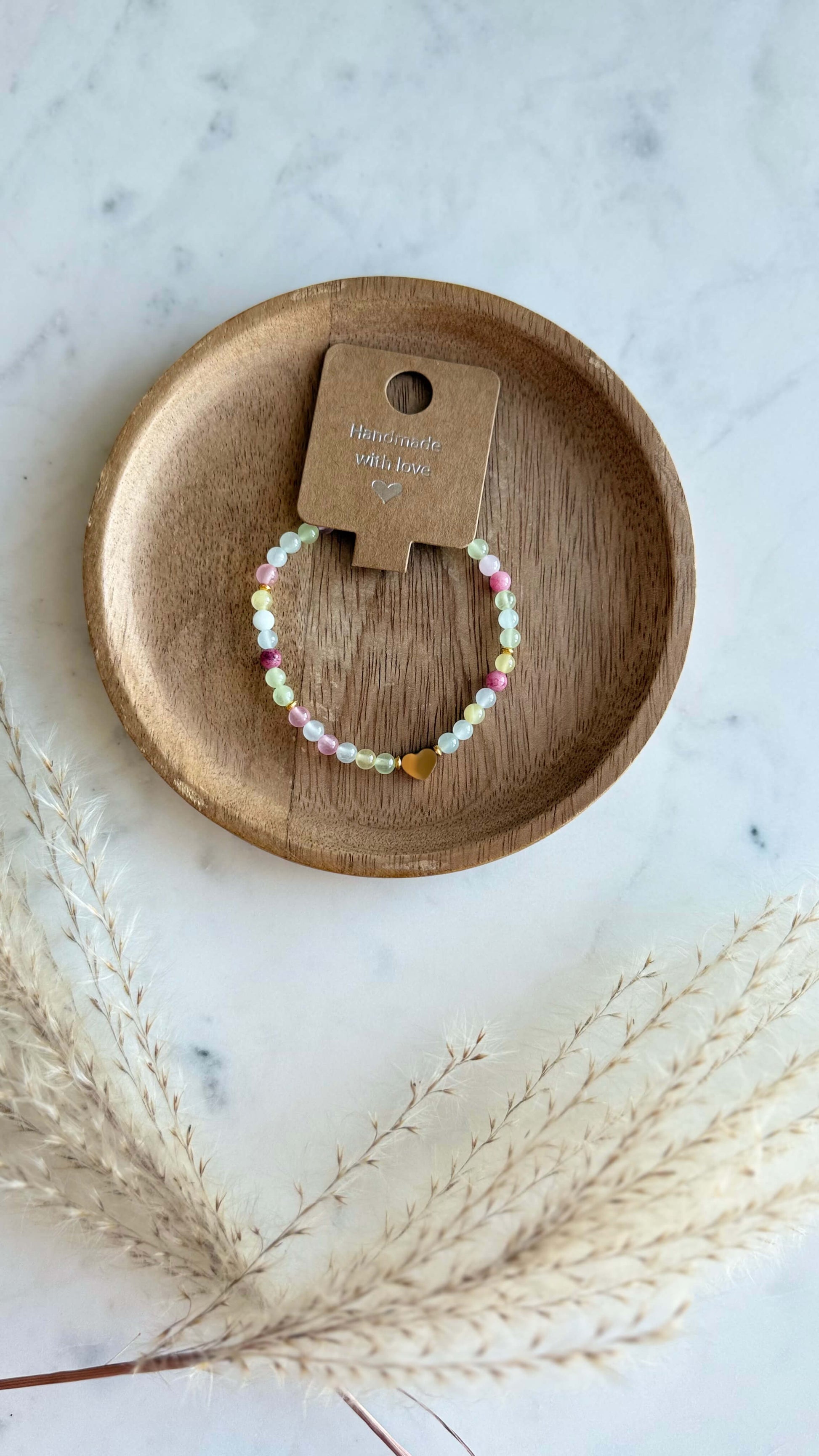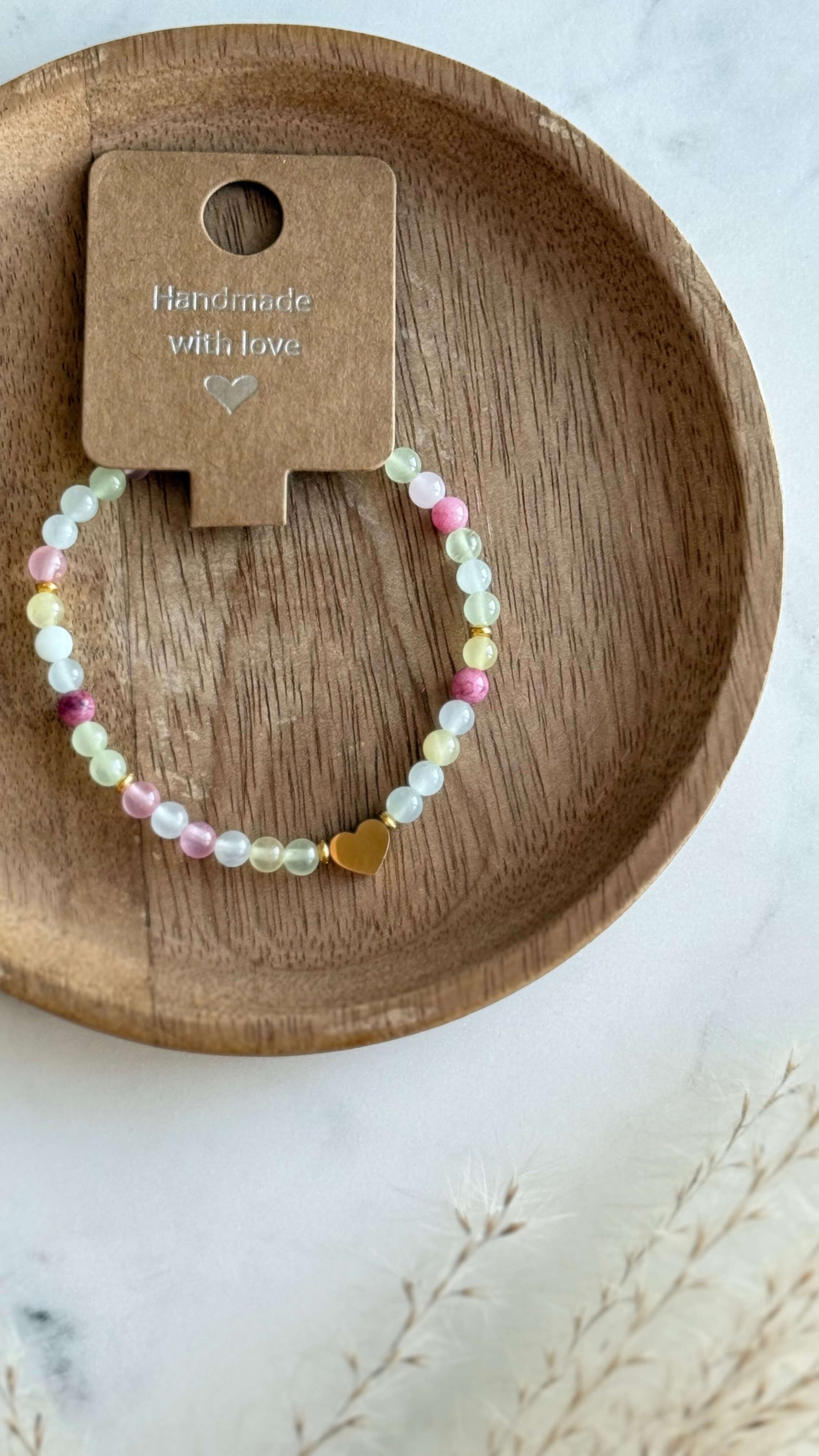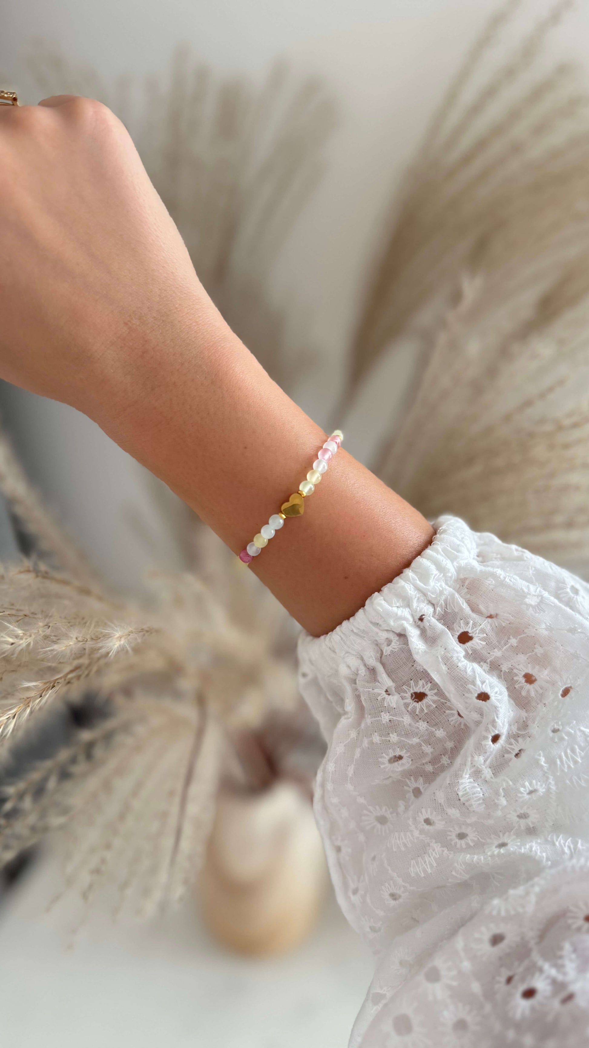 Delikatna bransoletka z naturalnych, pastelowych kamieni ozdobiona złotym serduszkiem ze stali nierdzewnej.