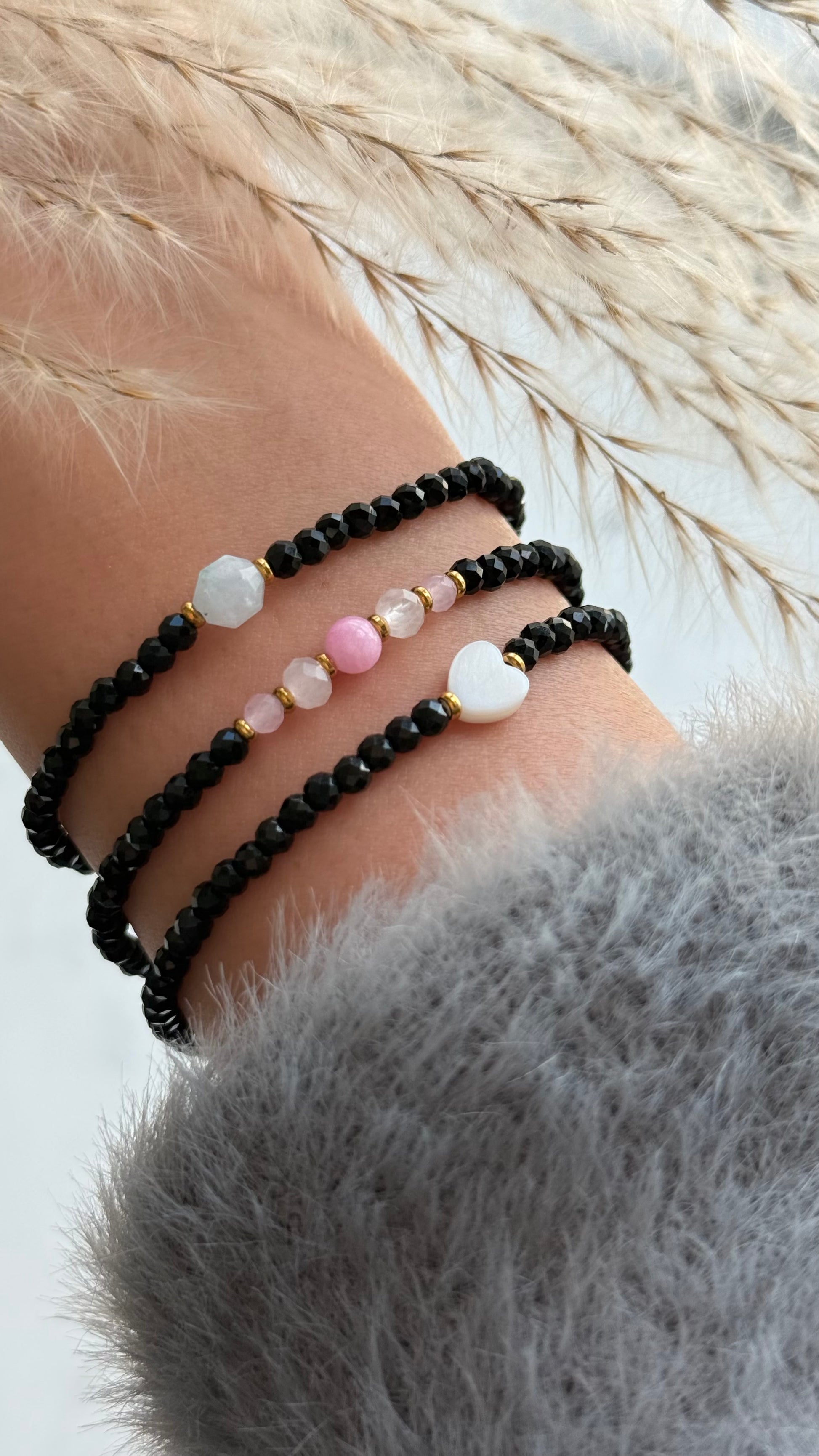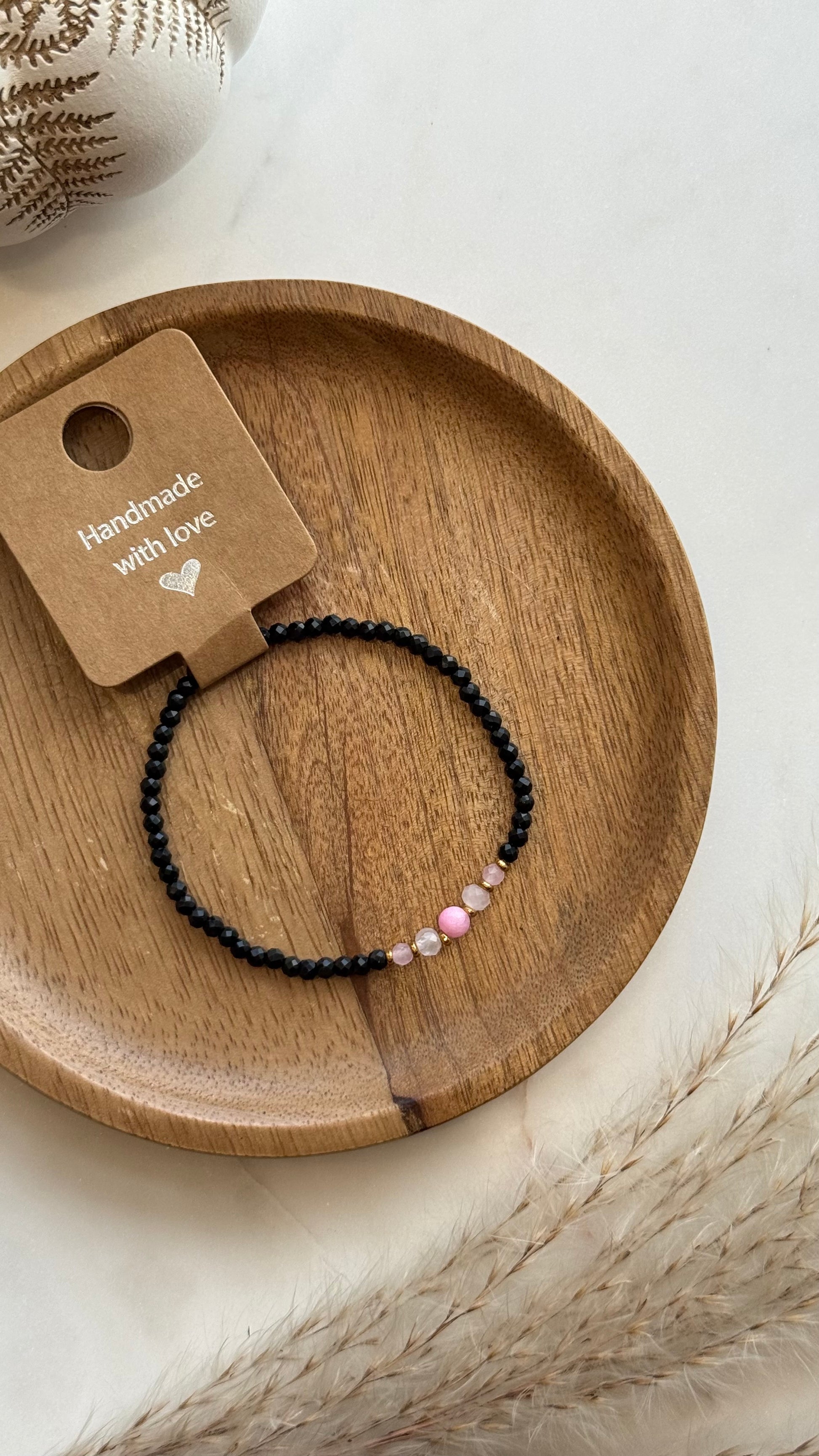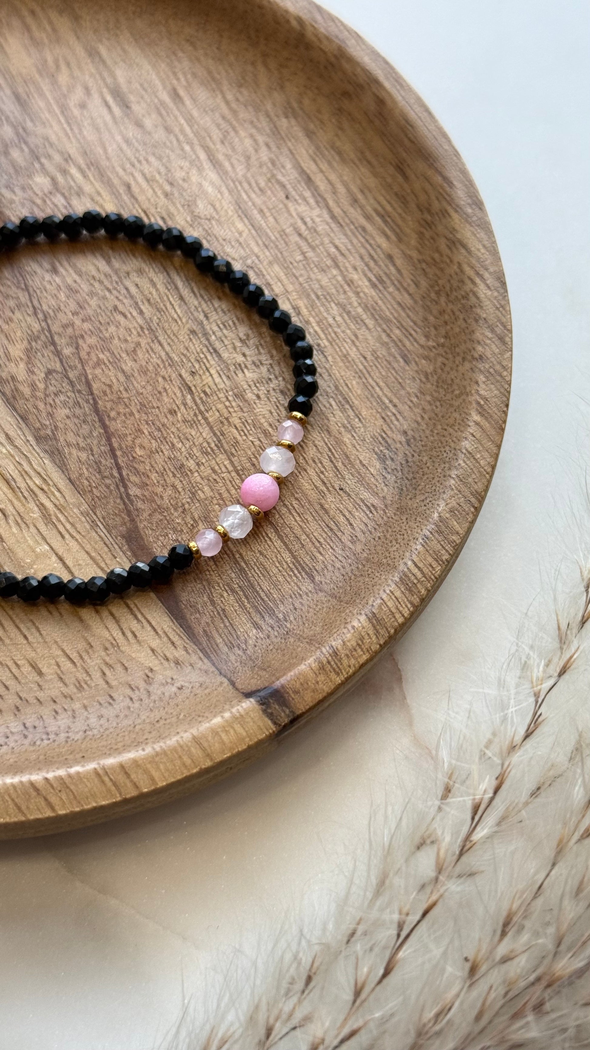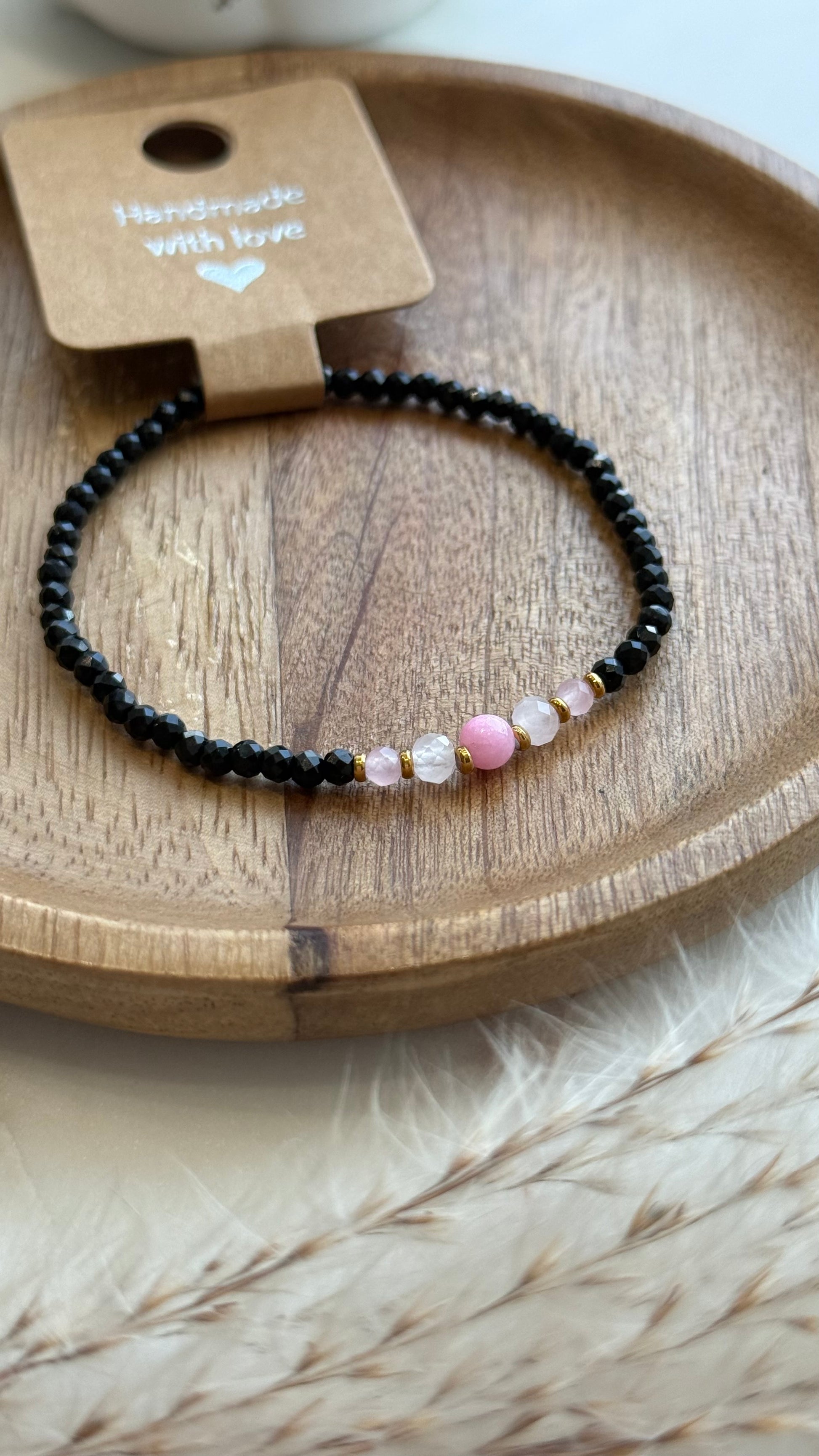 Bransoletka z czarnego turmalinu, różowego jadeitu i różowego kwarcu.