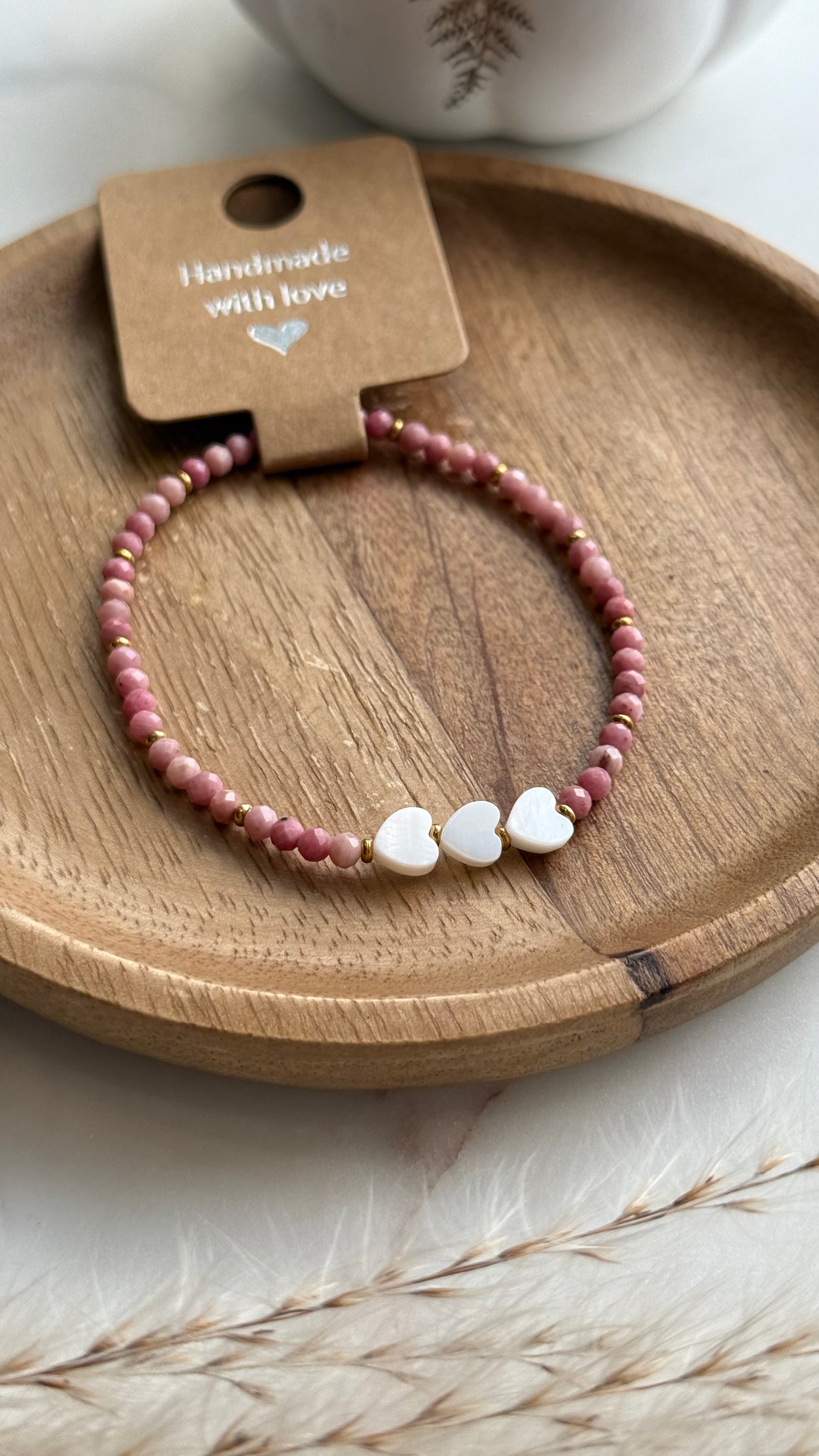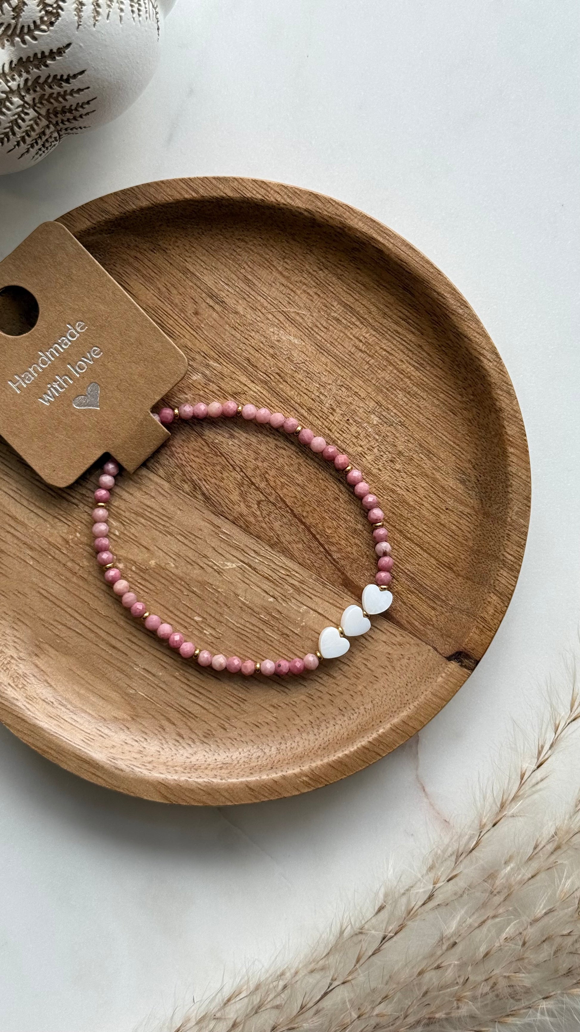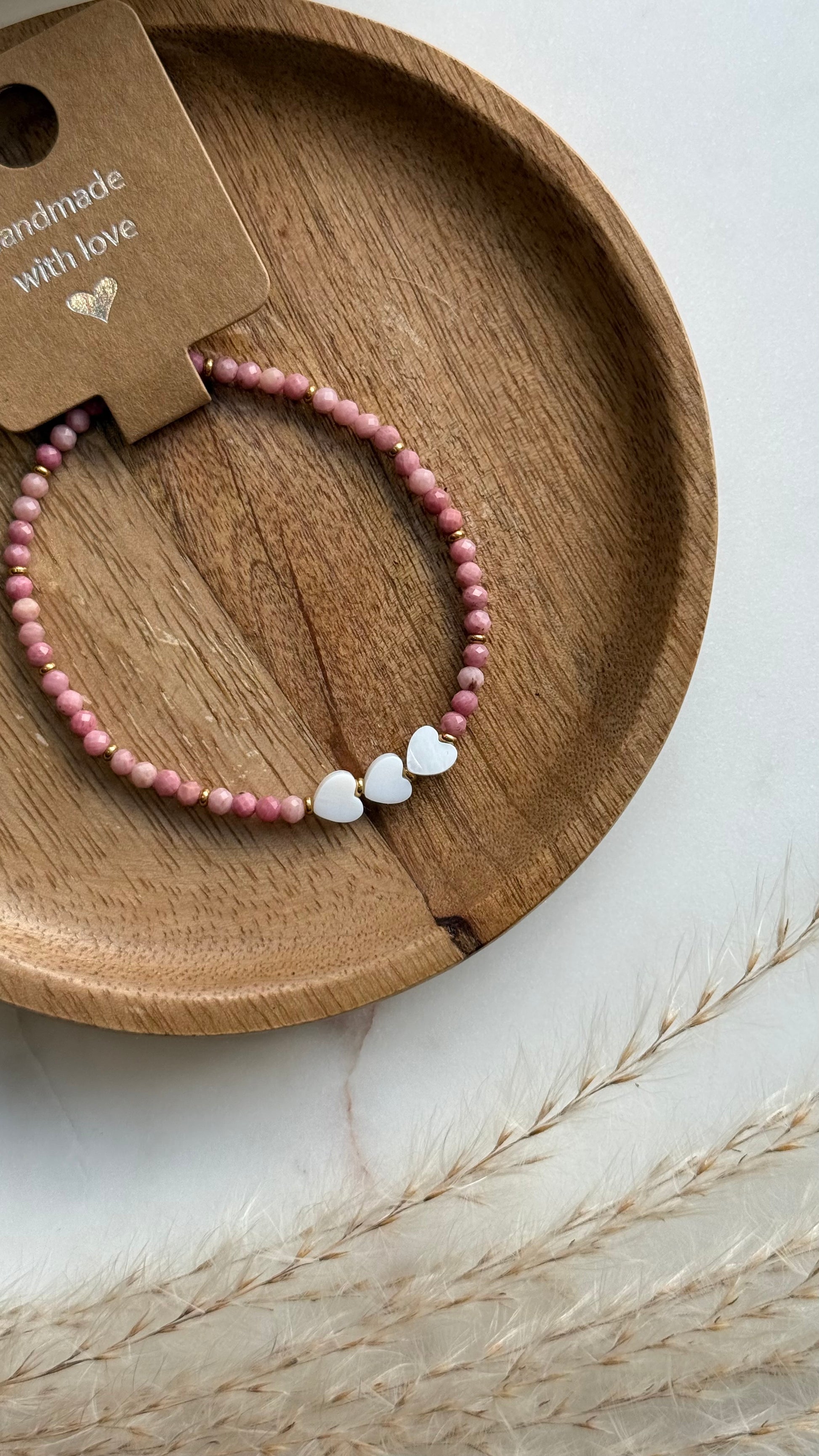 Bransoletka z rodochrozytu i serduszkami z masy perłowej.