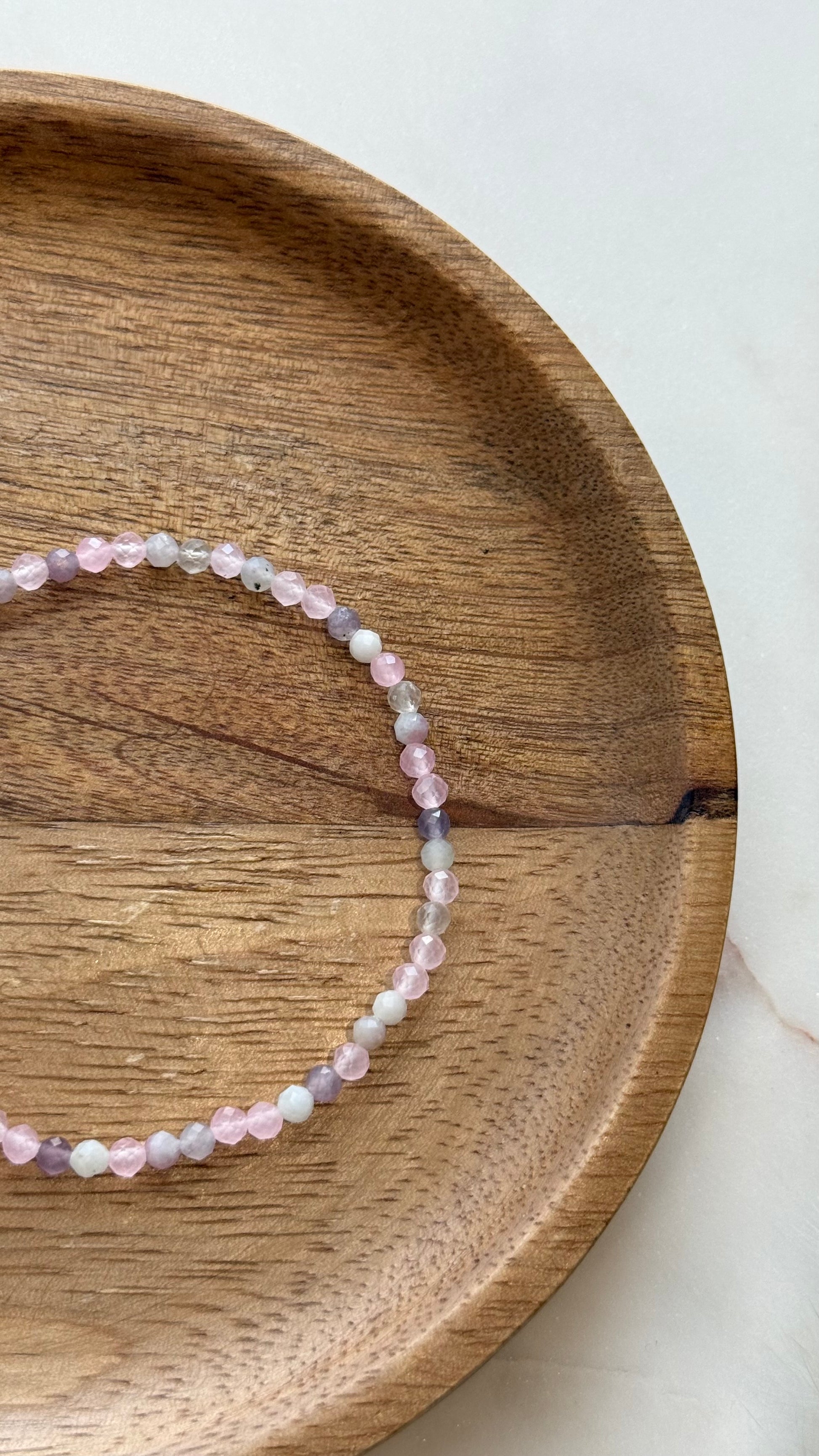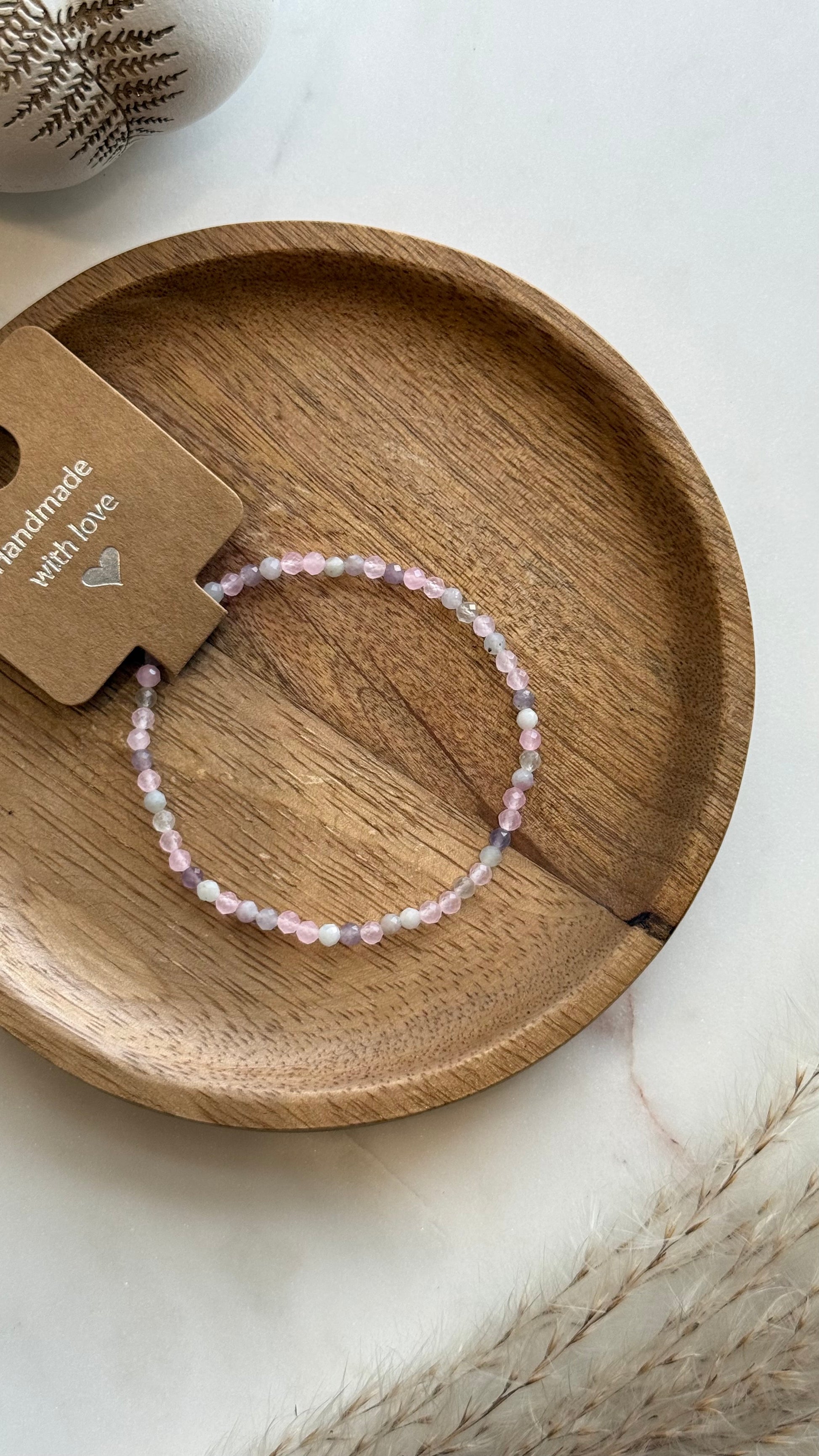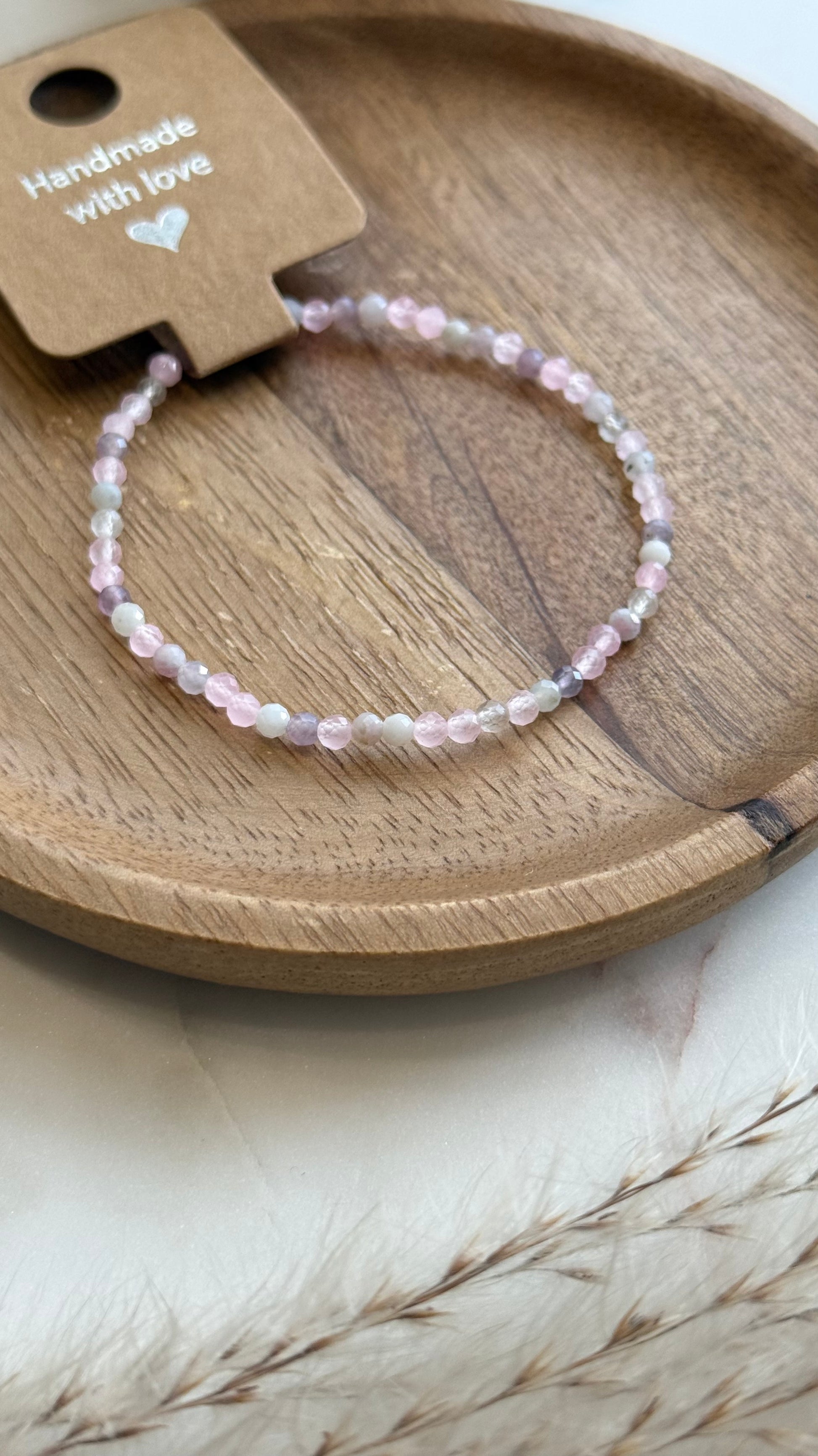 Bransoletka z turmalinu. Połączenie ciepłego różu, delikatnej szarości i fioletu symbolizuje równowagę i spokój. Biżuteria, która subtelnie dopełnia każdą stylizację.