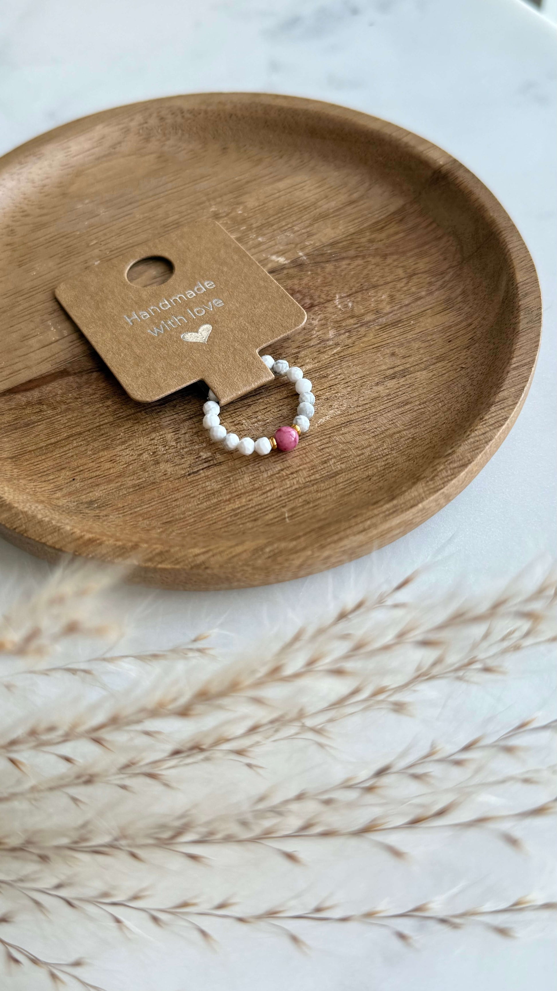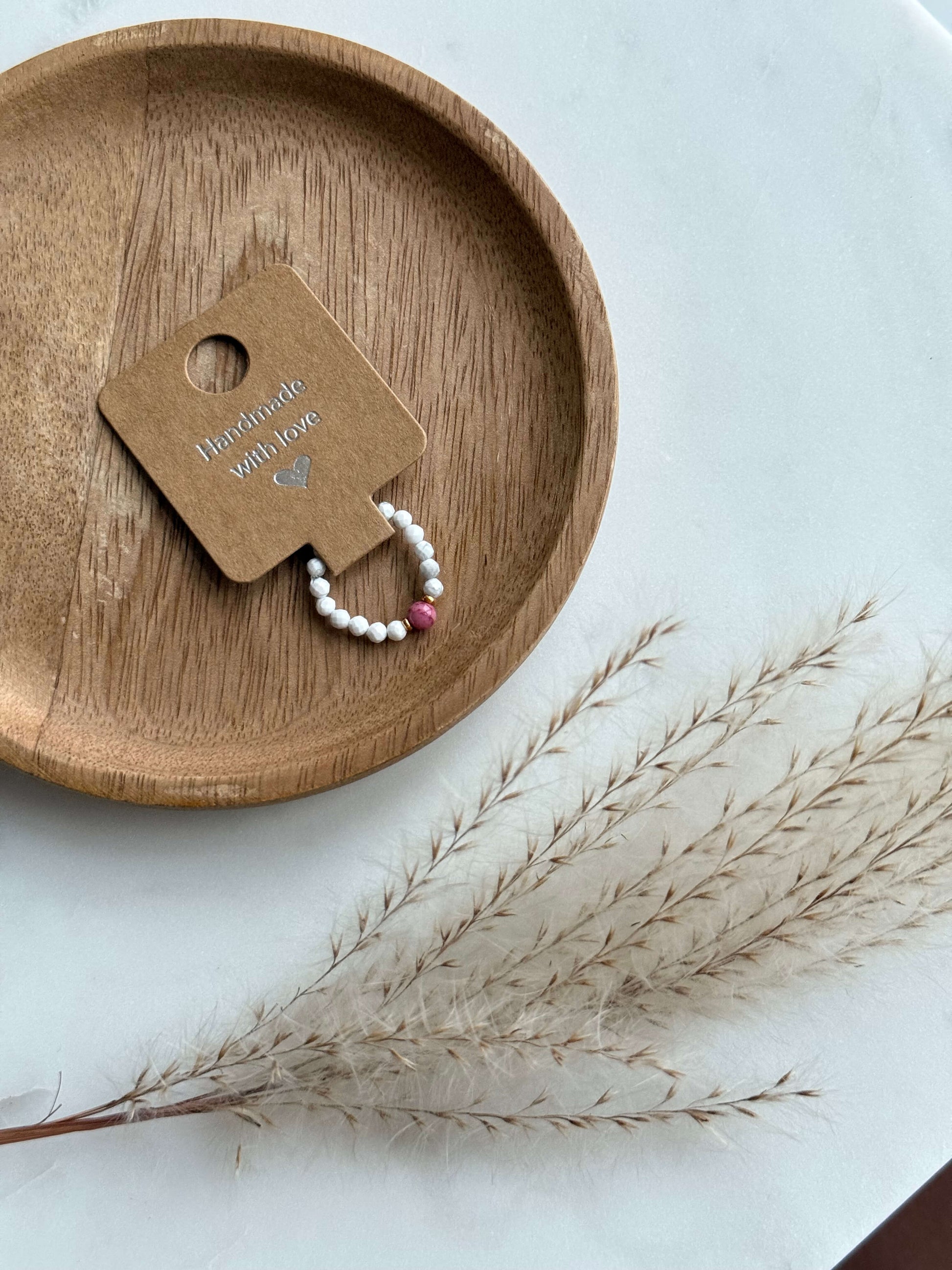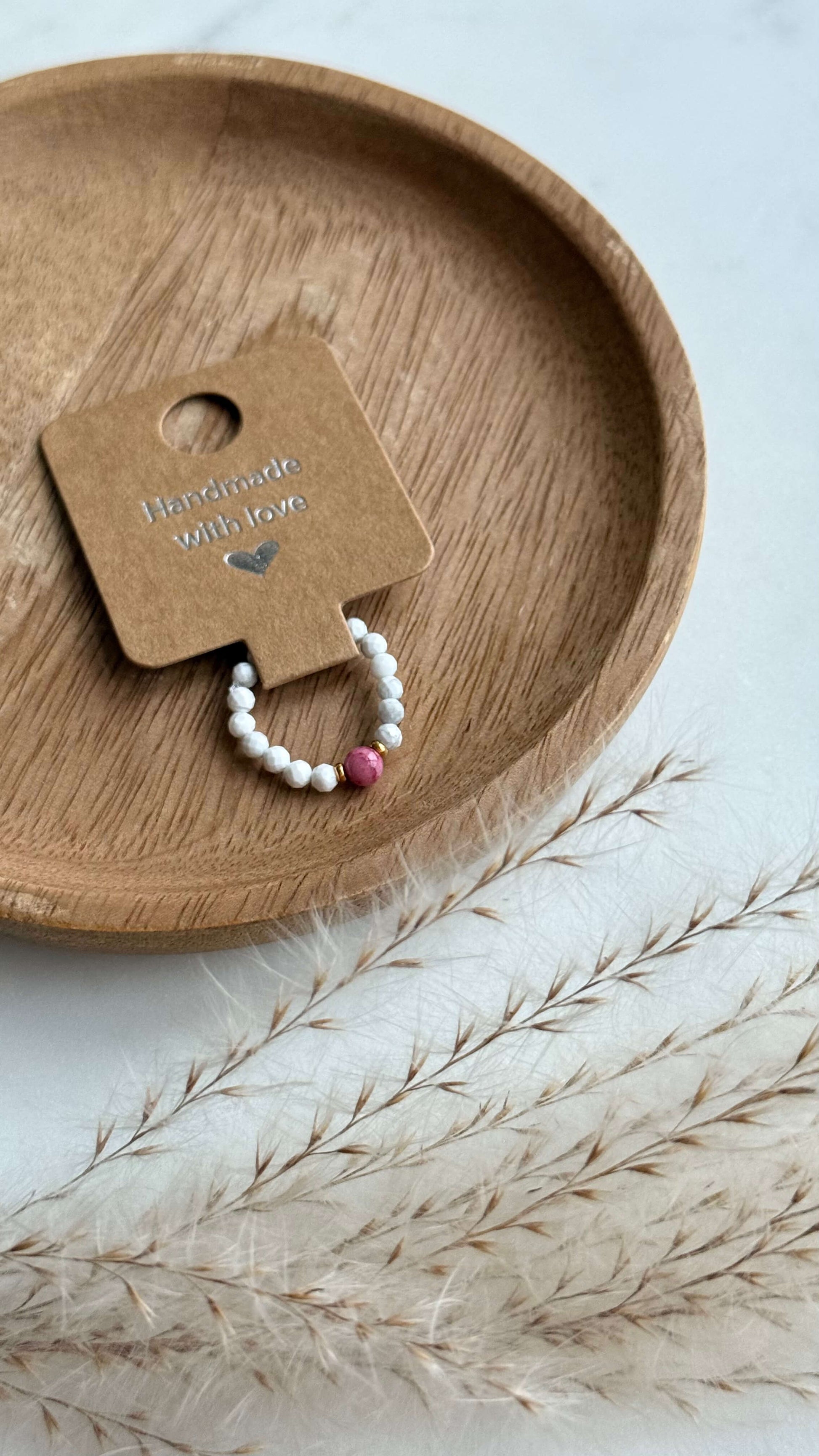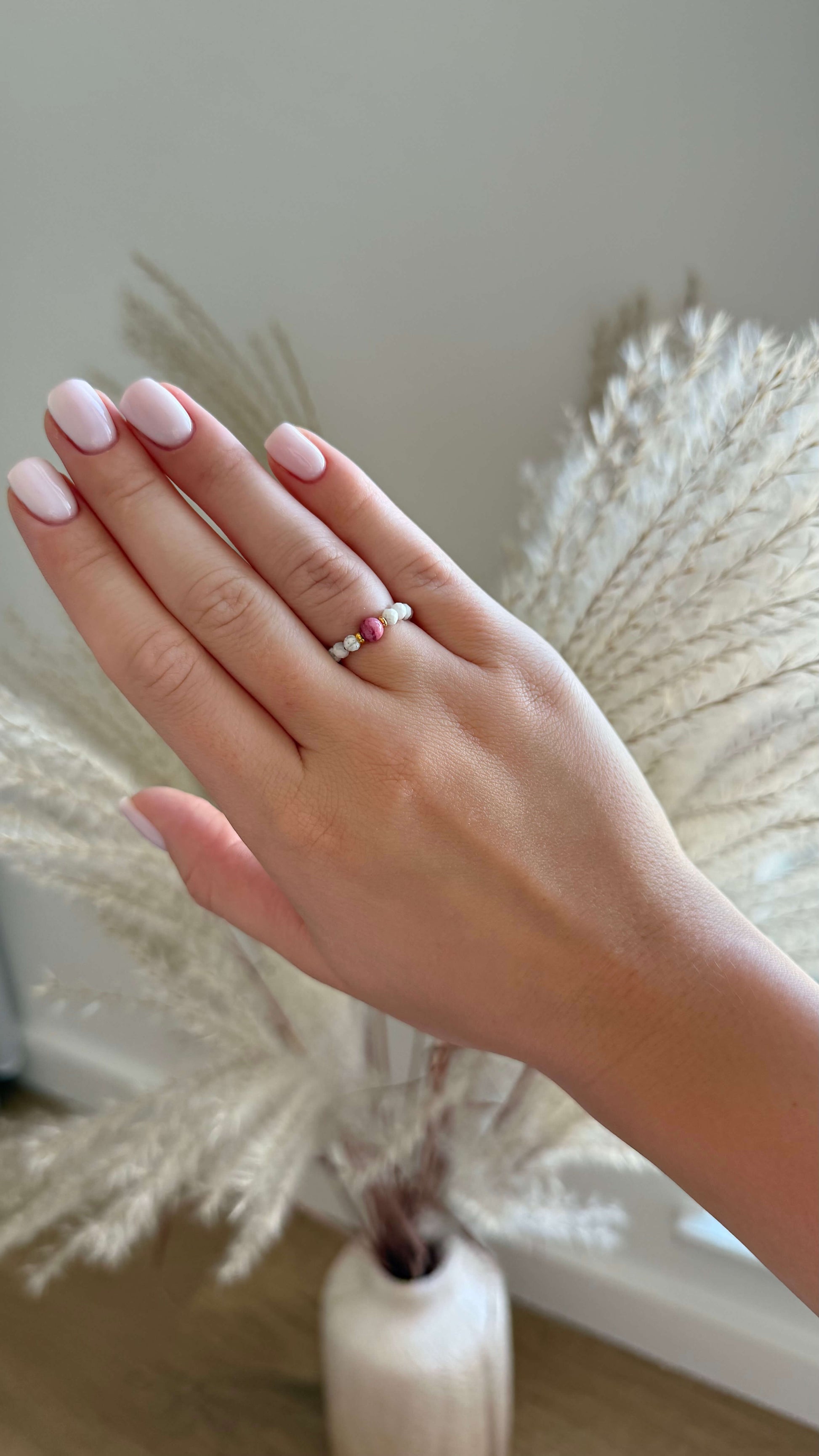 Delikatny, ale wyrazisty pierścionek z drobnych biało-szarych kamieni, przełamany kulką w intensywnie różowym kolorze.