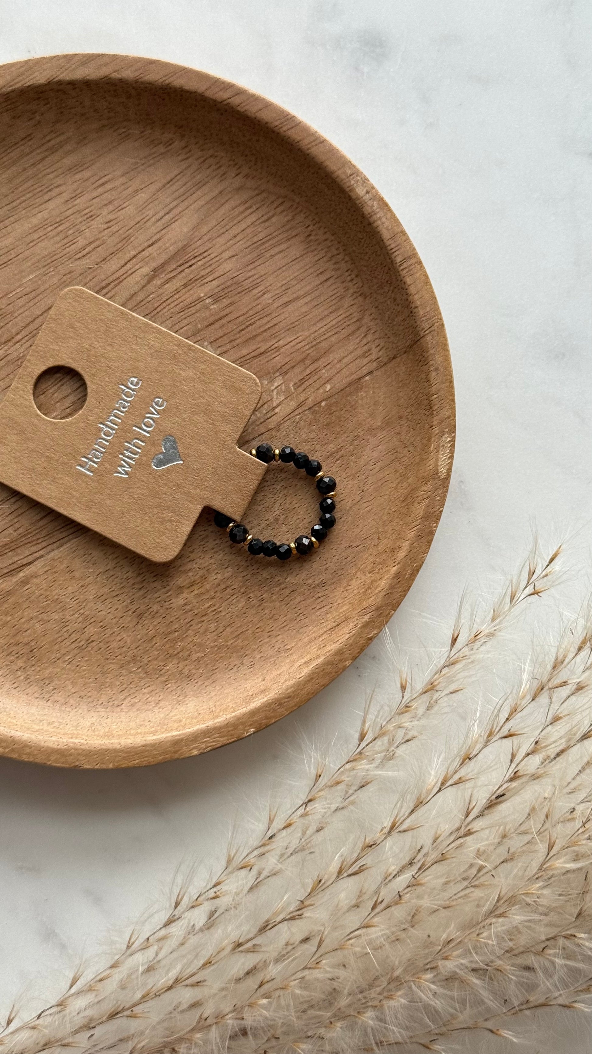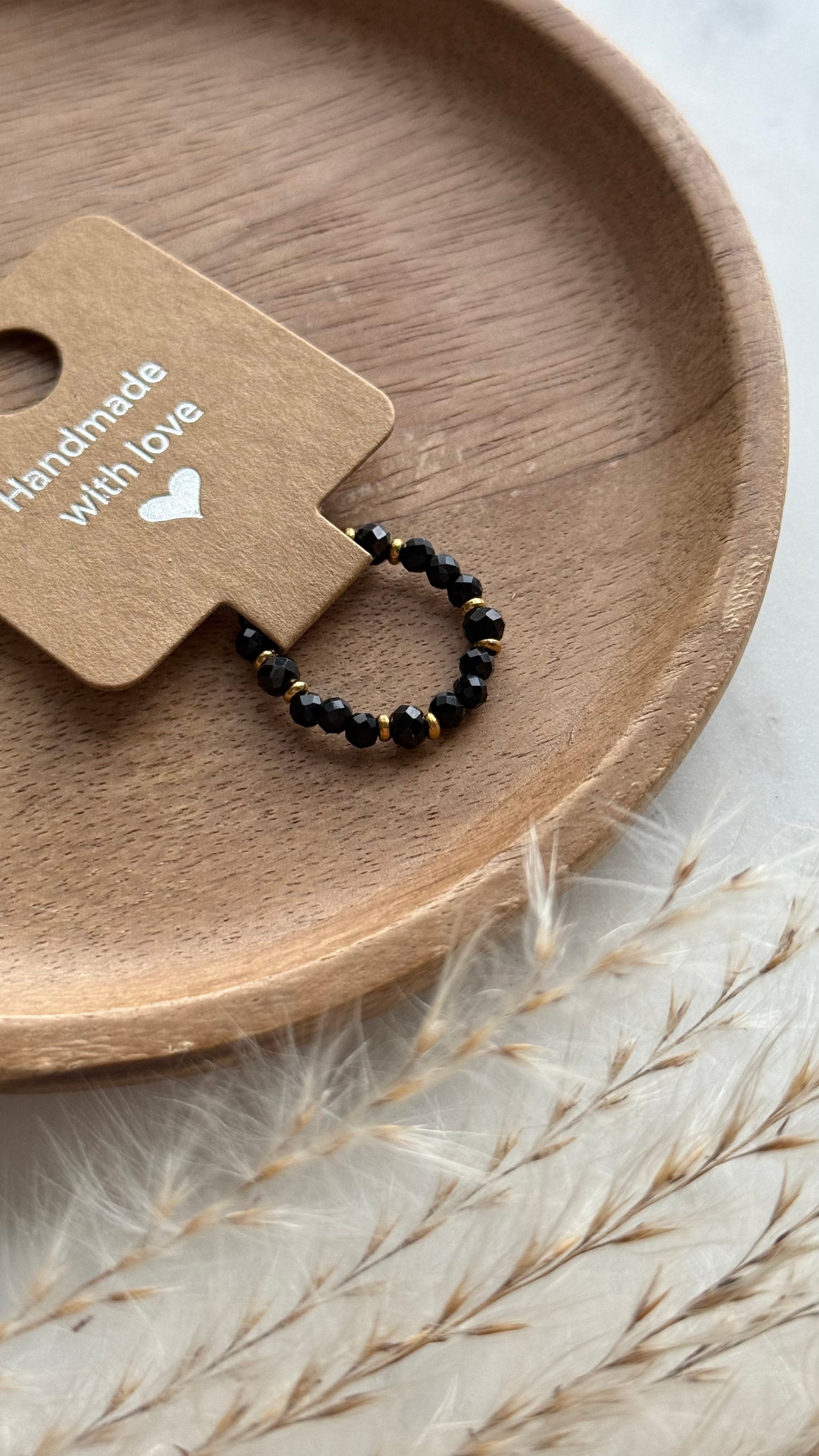 Minimalistyczny pierścionek w całości wykonany z czarnych kamieni fasetowanych ze złotymi detalami.