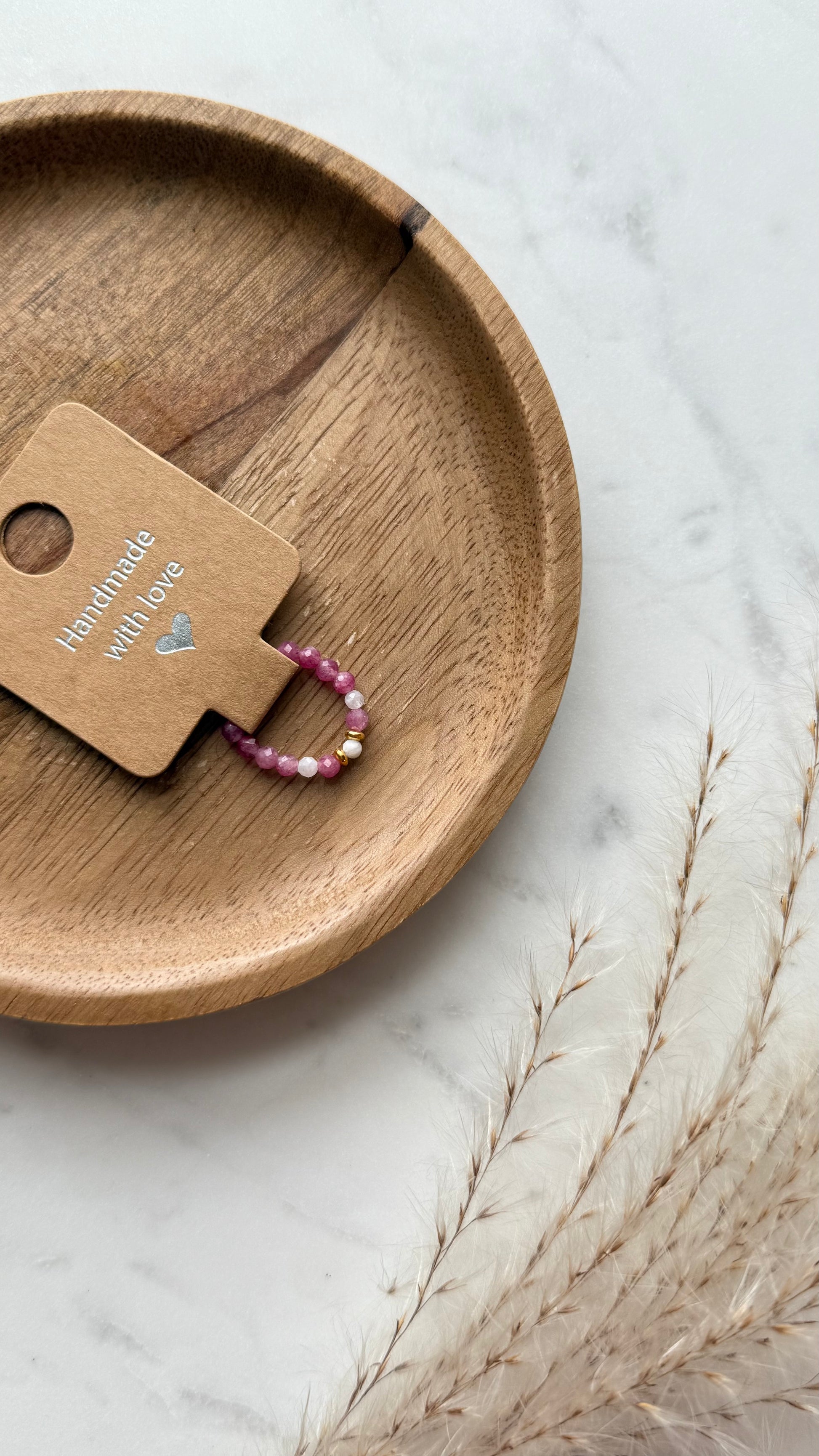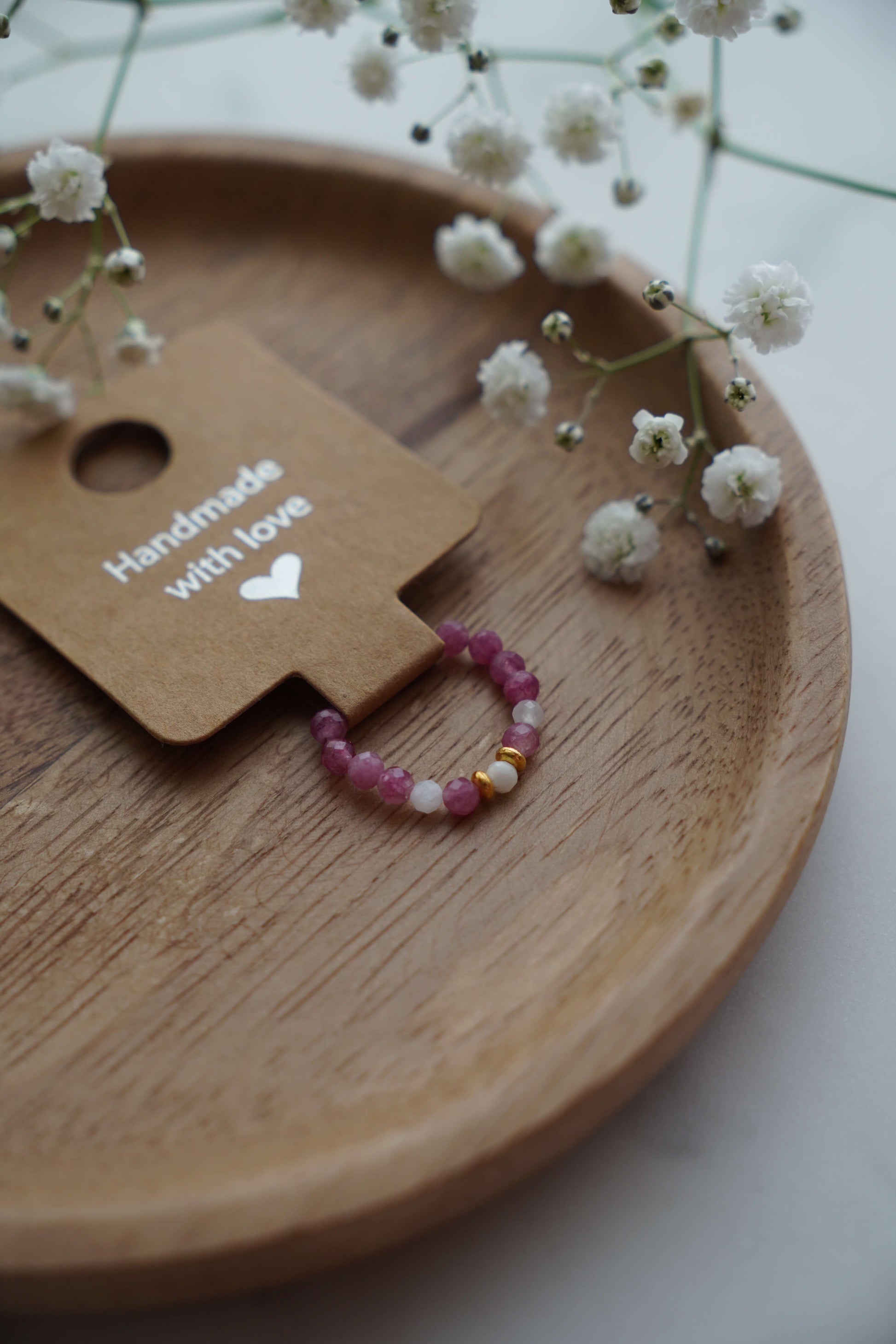 Delikatna kompozycja z białych kamieni księżycowych i różowego turmalinu, inspirowana pierwszymi kwiatami wiosny. Pierścionek pełen wdzięku i kobiecej energii.