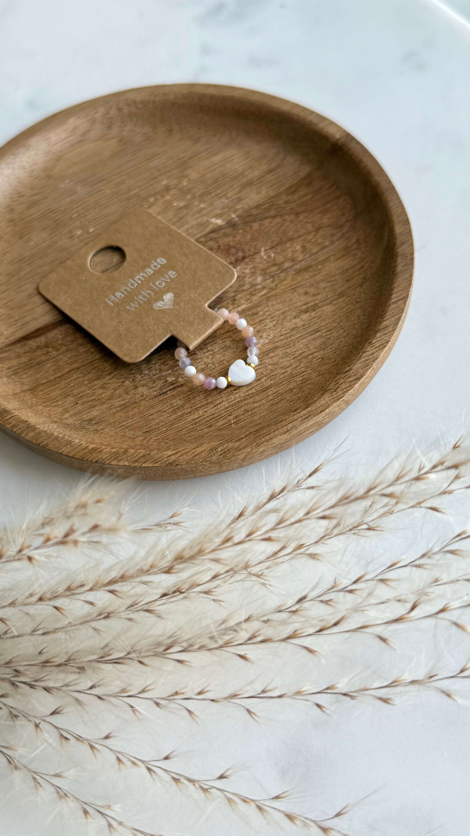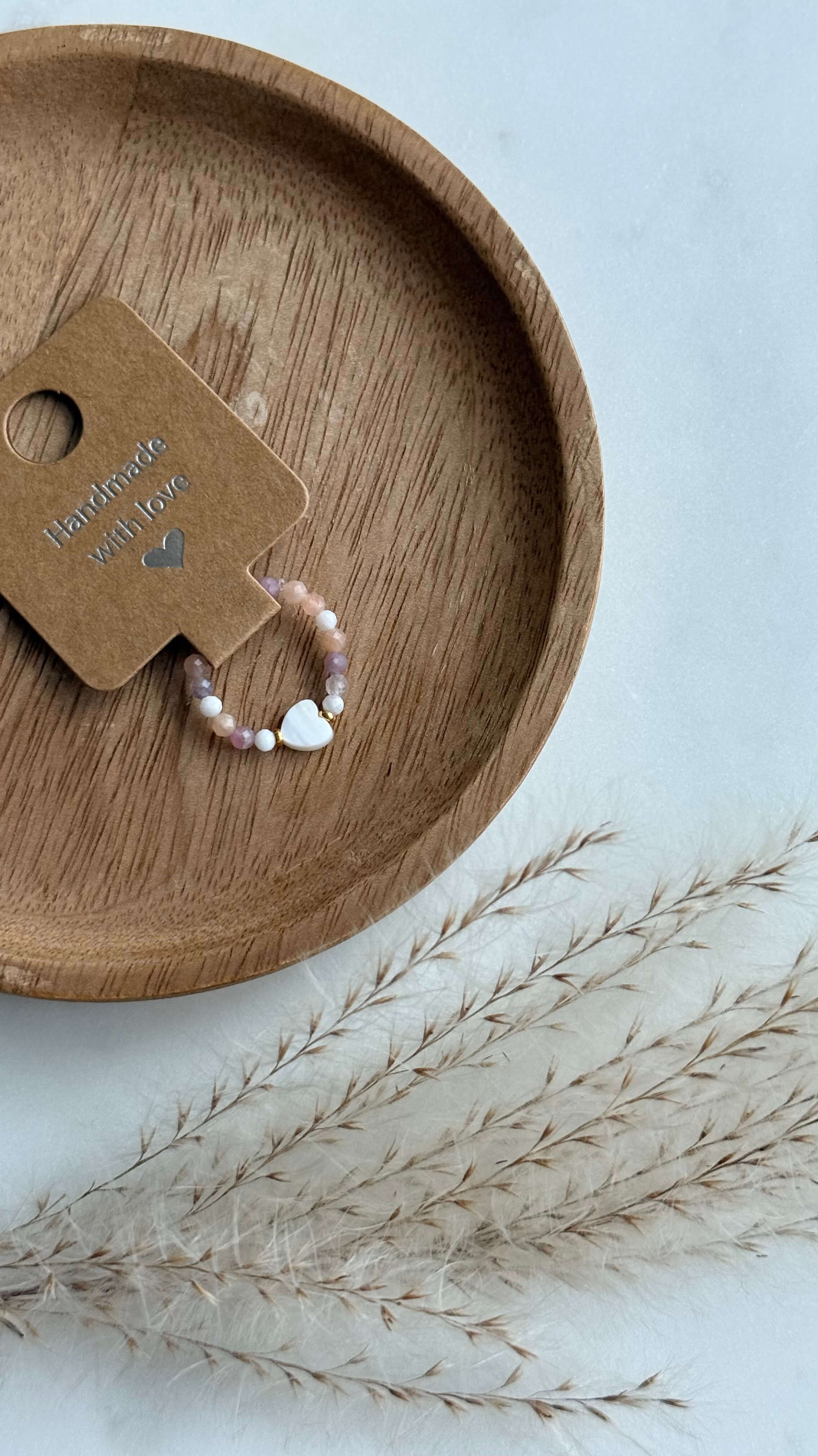 Delikatny pierścionek z kamieni słonecznych,naturalnego obsydianu i różowego kwarcu z serduszkiem z masy perłowej.