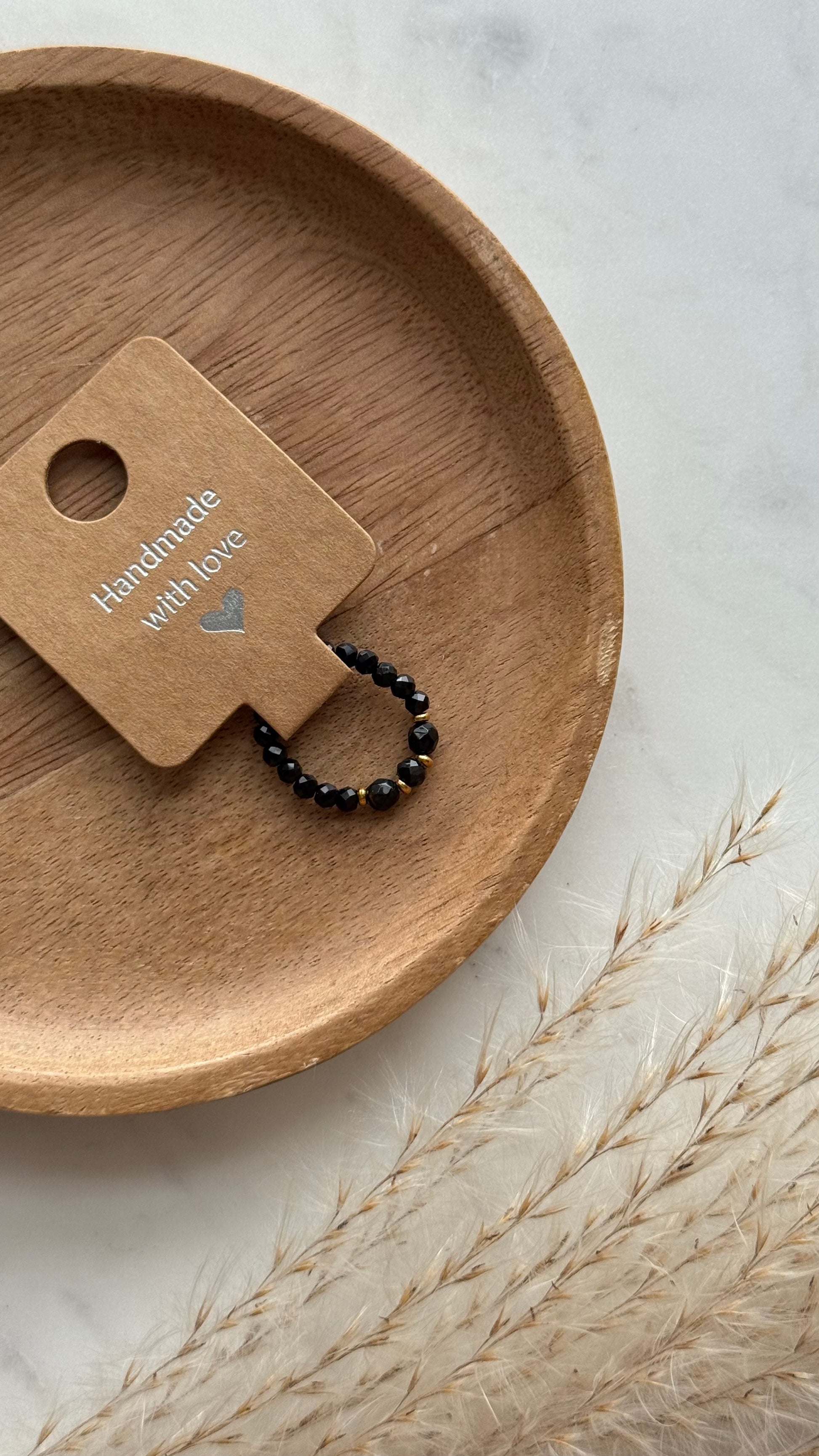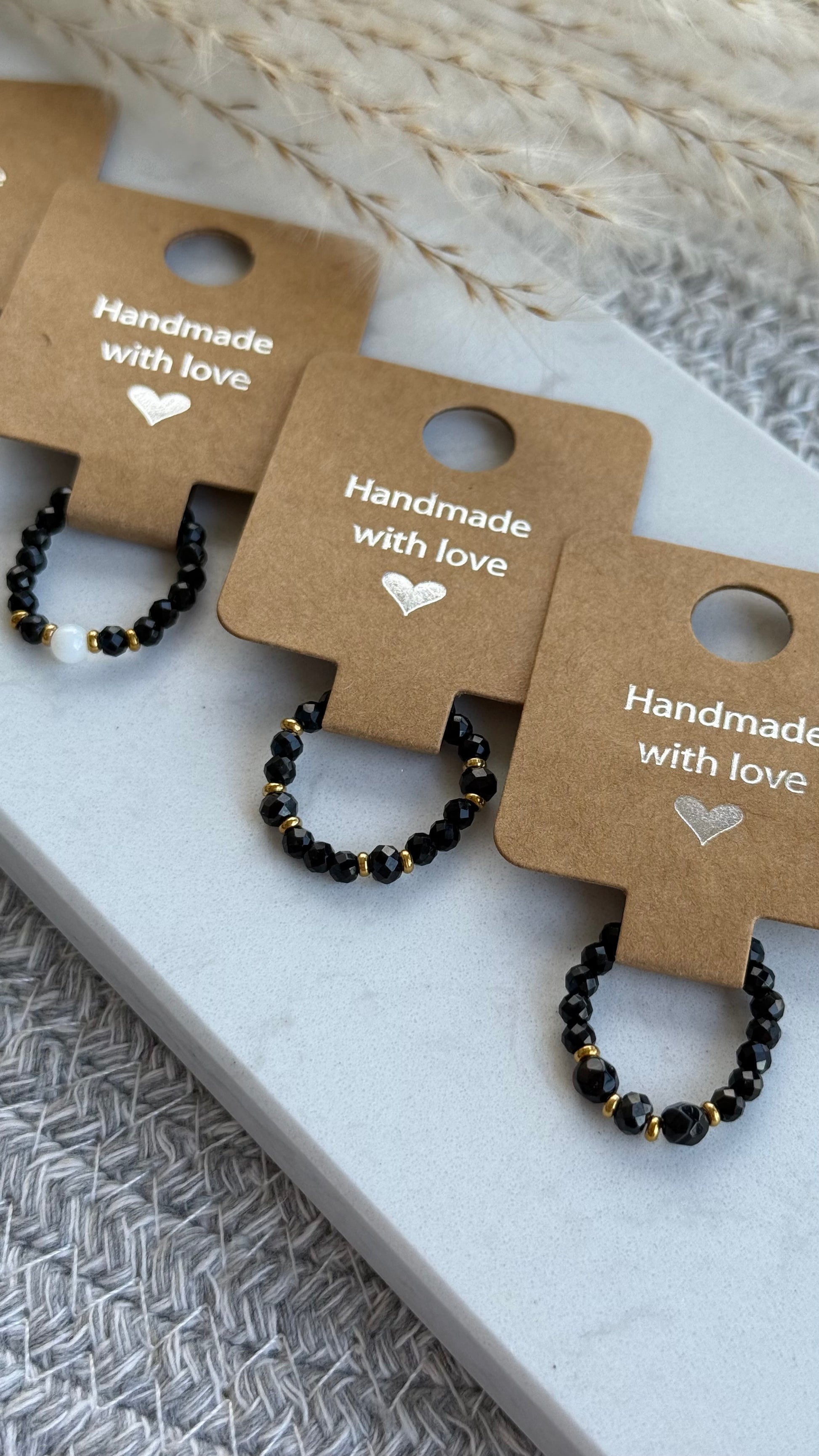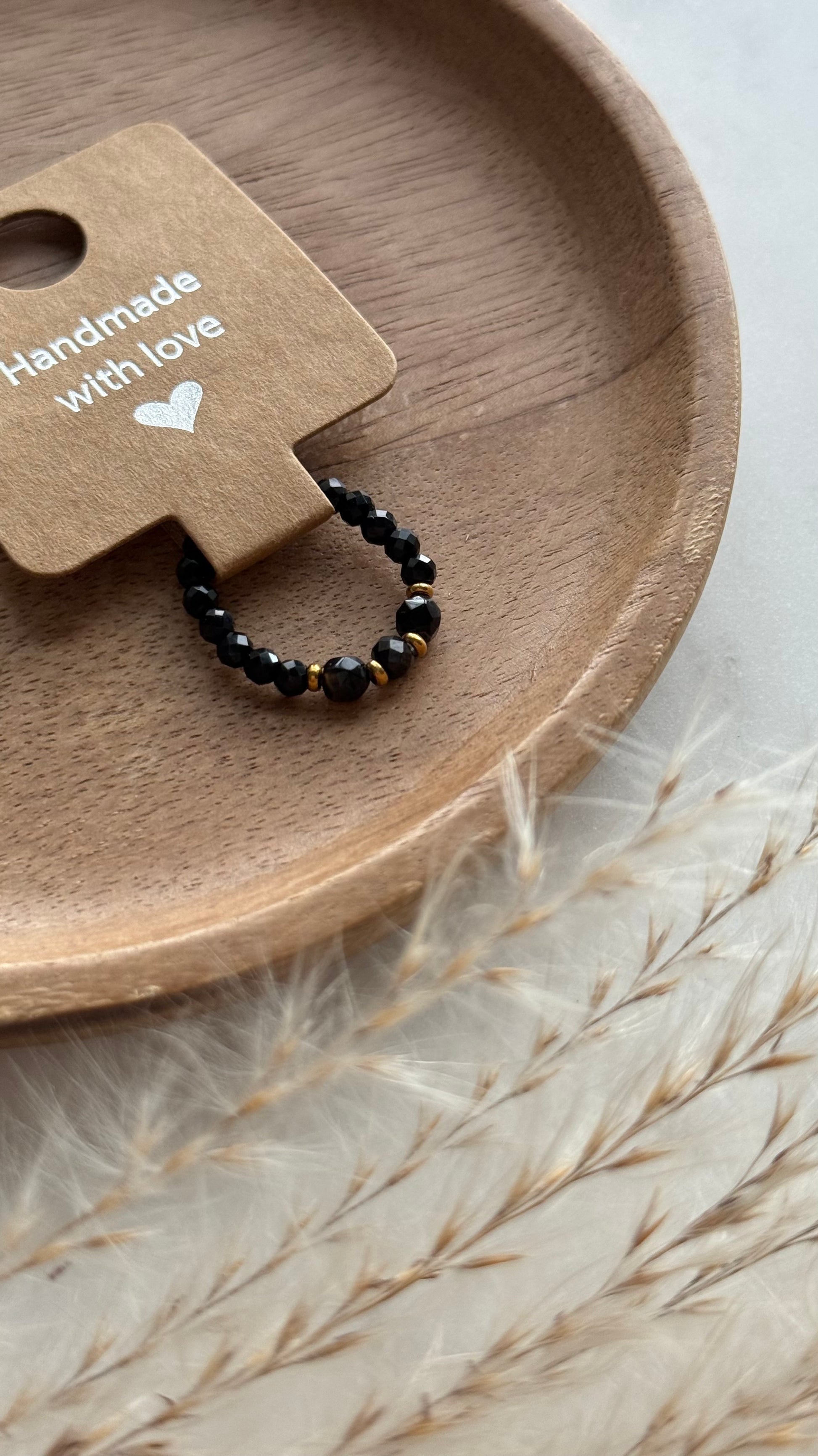 Czarny pierścionek z fasetowanych kamieni ozdobiony złotymi akcentami.