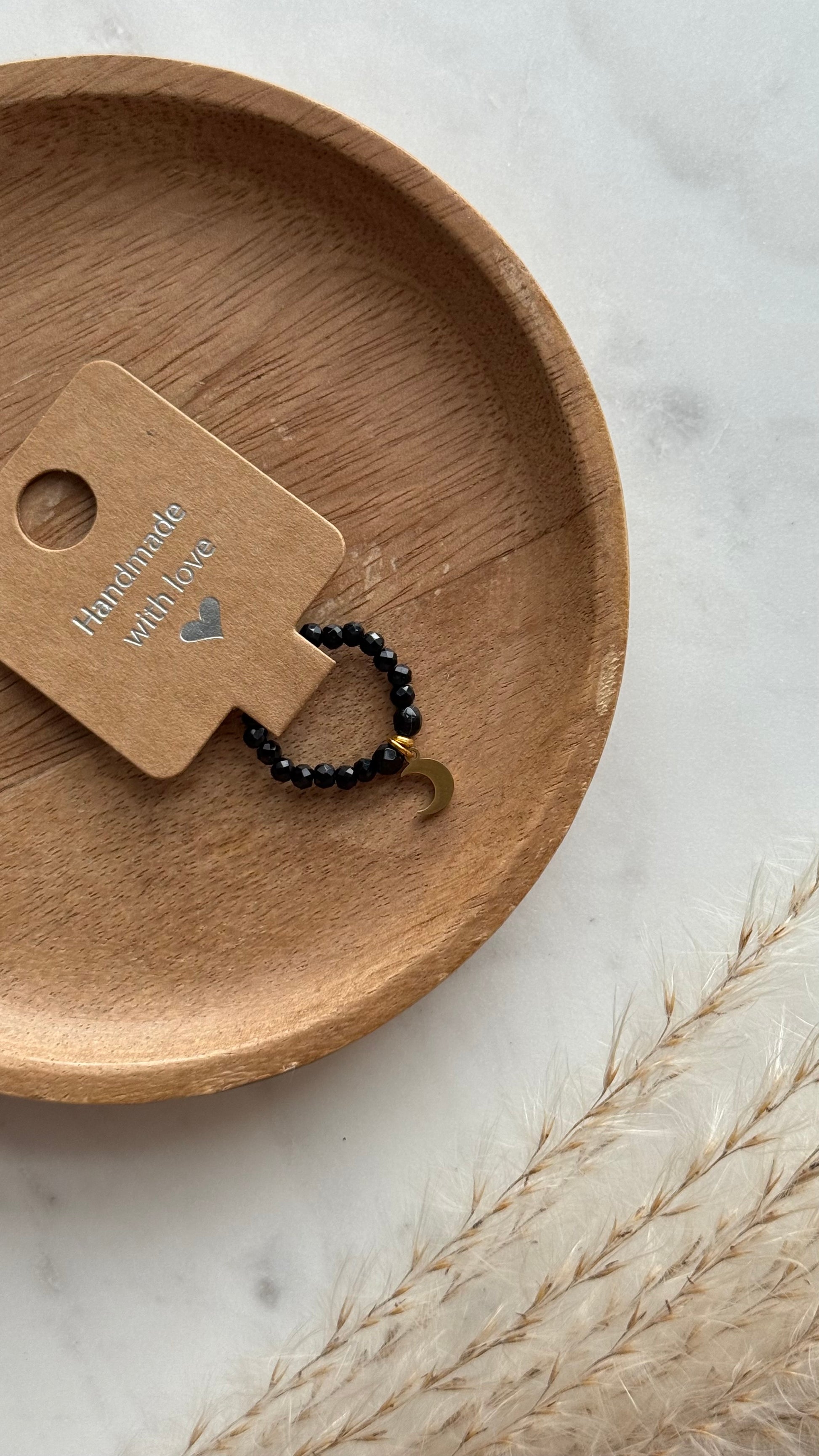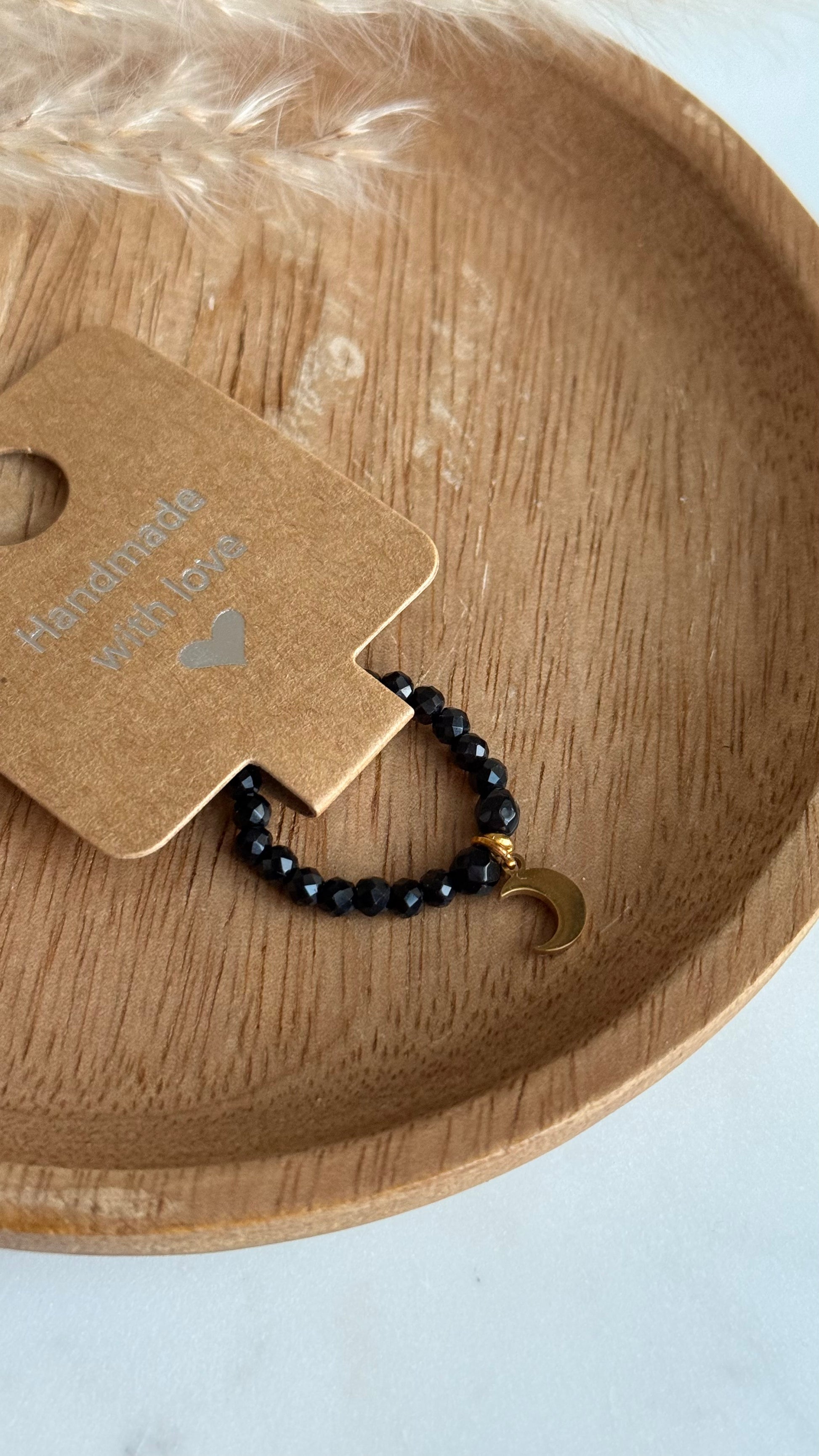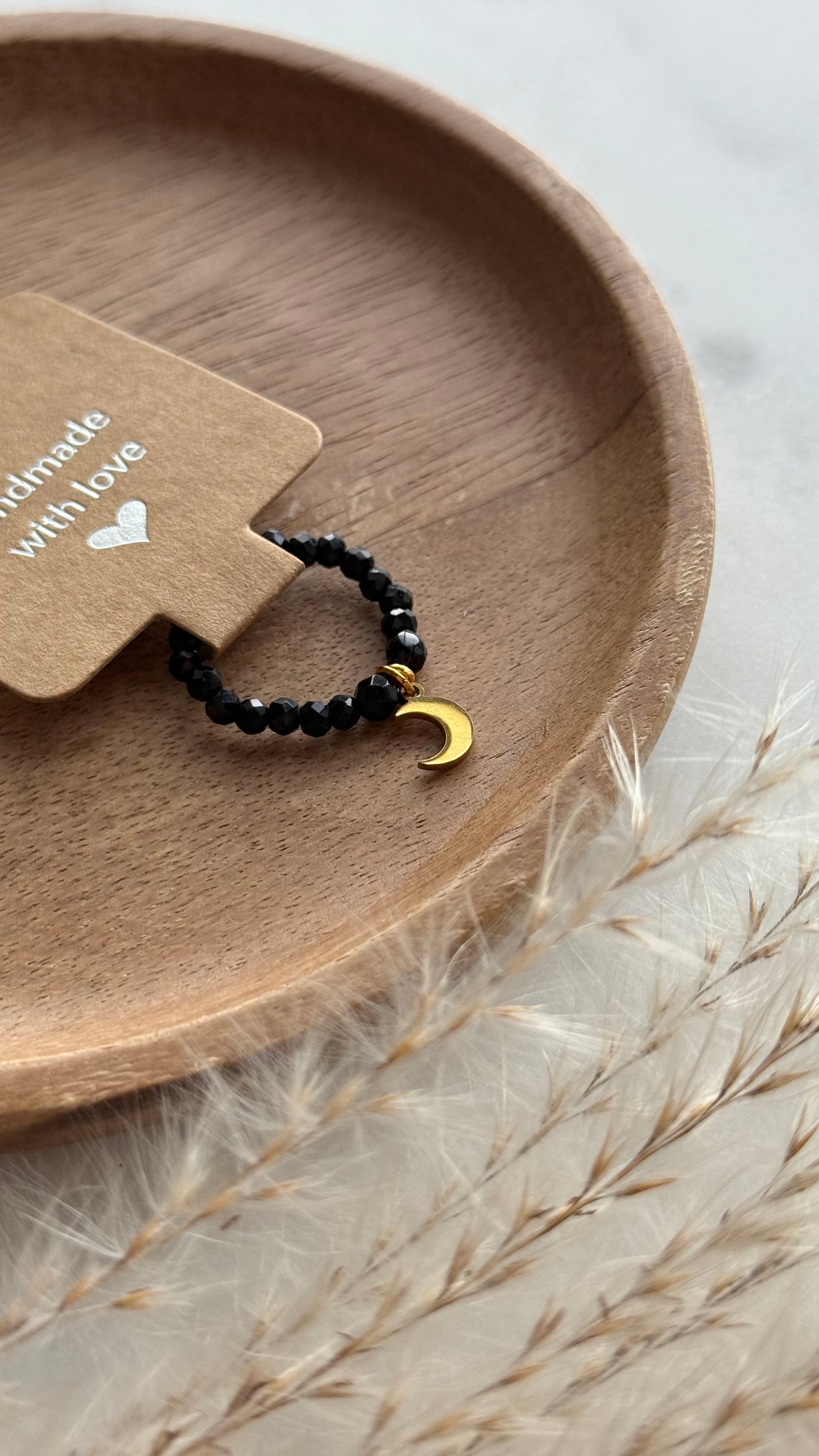 Minimalistyczny pierścionek z czarnych kamieni fasetowanych i złotym księżycem ze stali nierdzewnej.