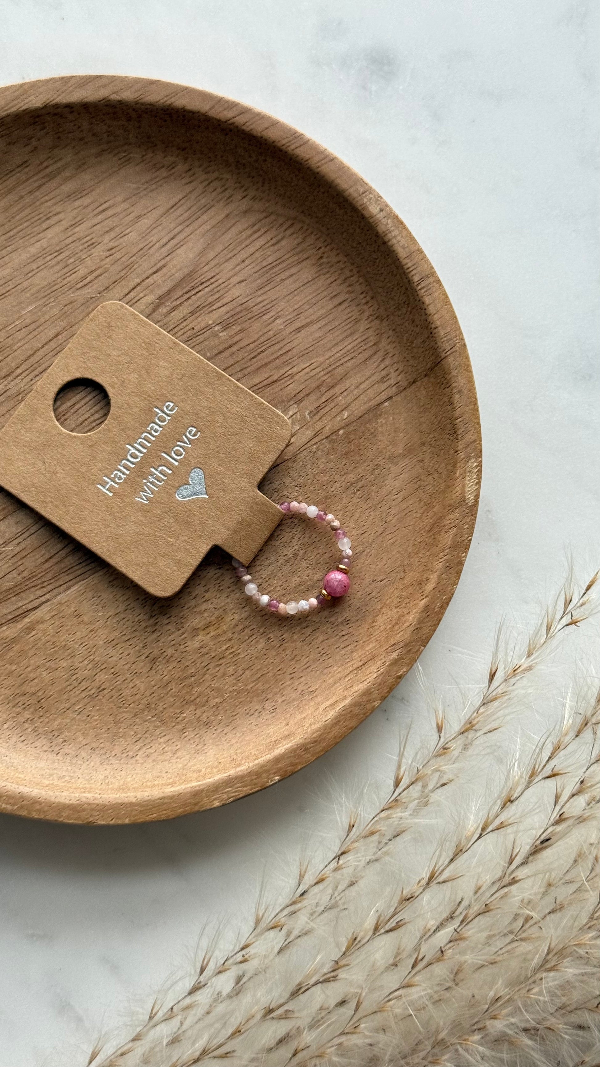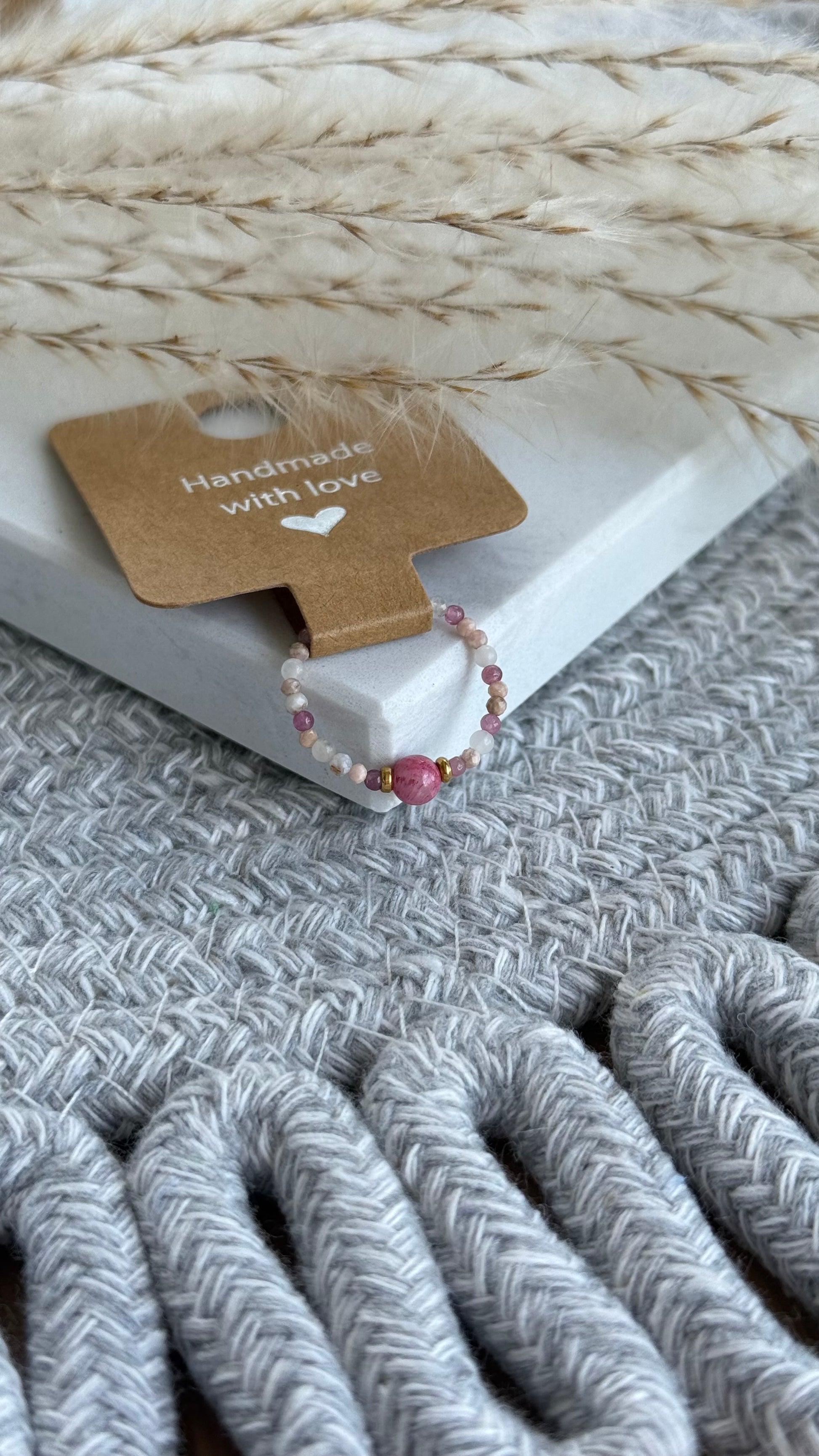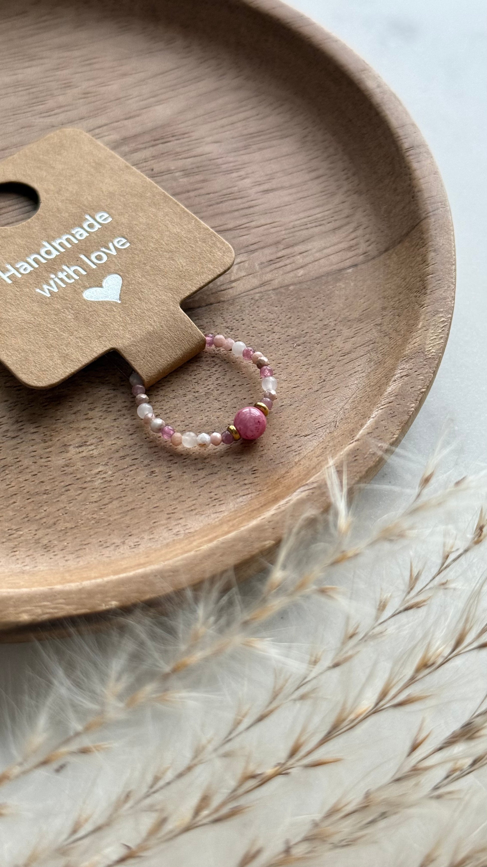 Pierścionek z drobnych, różowych kamieni naturalnych o wielkości 2mm z wyrazistym akcentem-ciemnoróżowym koralikiem.