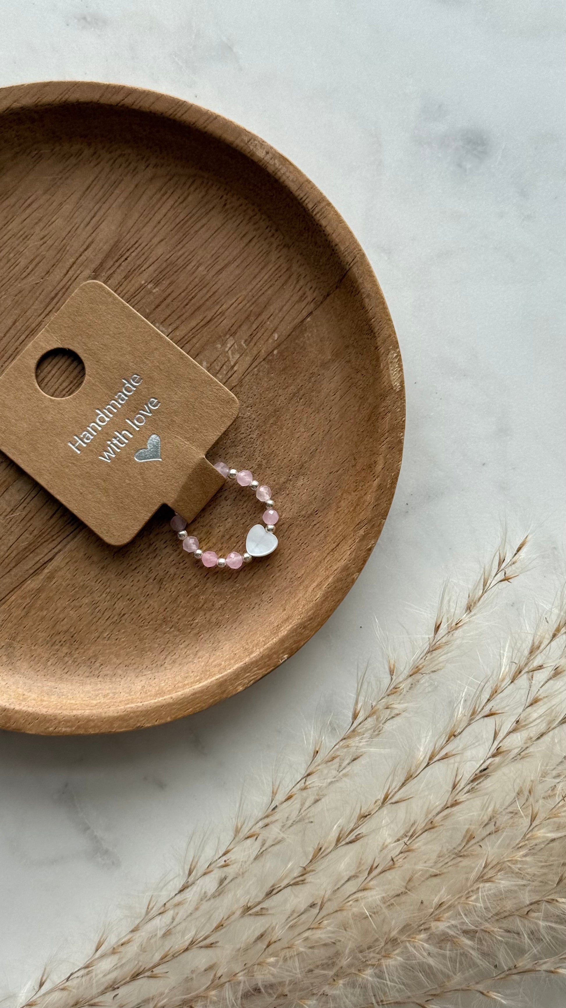 Delikatny pierścionek z różowego kwarcu i serduszkiem z masy perłowej, przeplatany kuleczkami ze stali chirurgicznej.