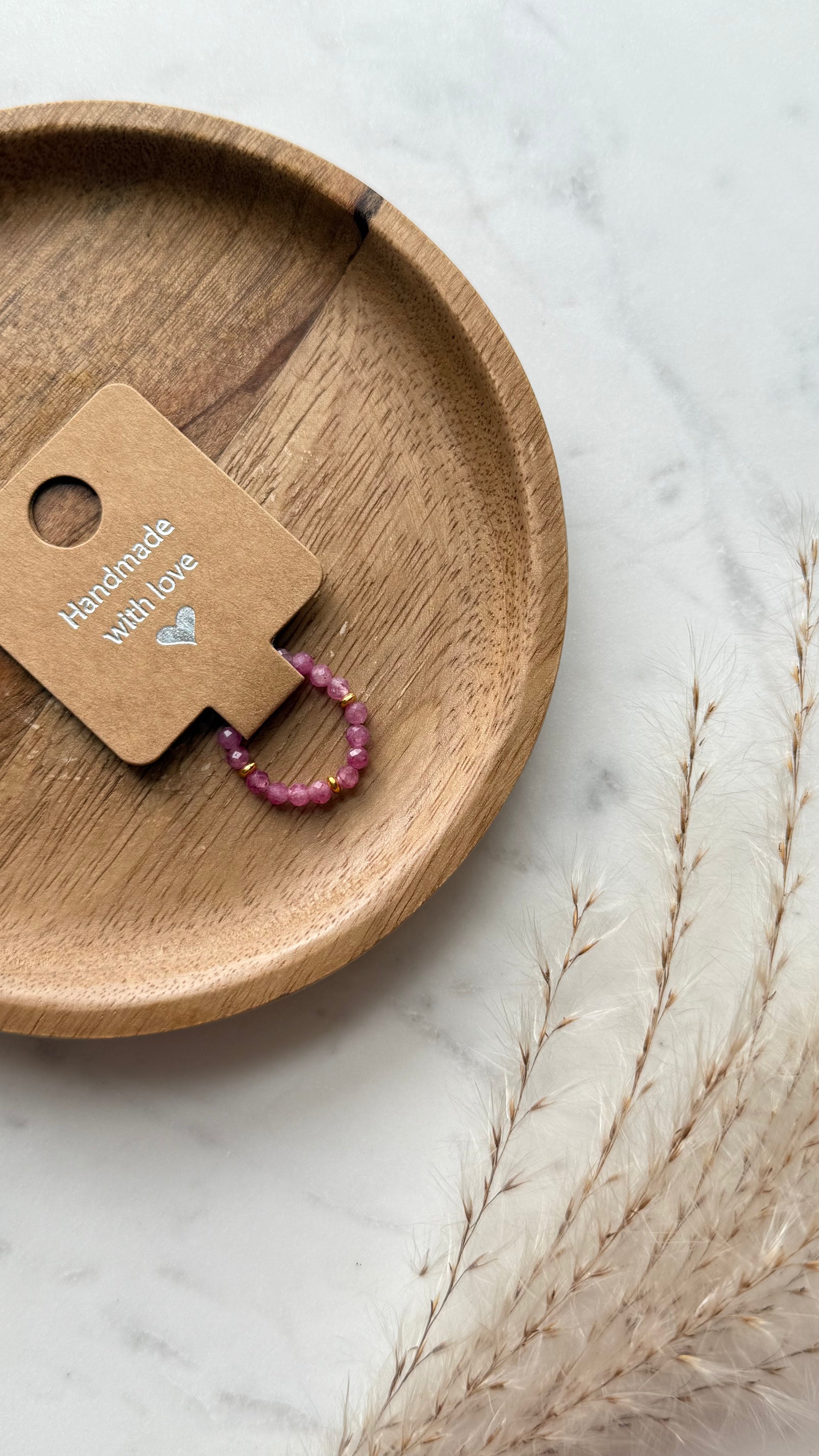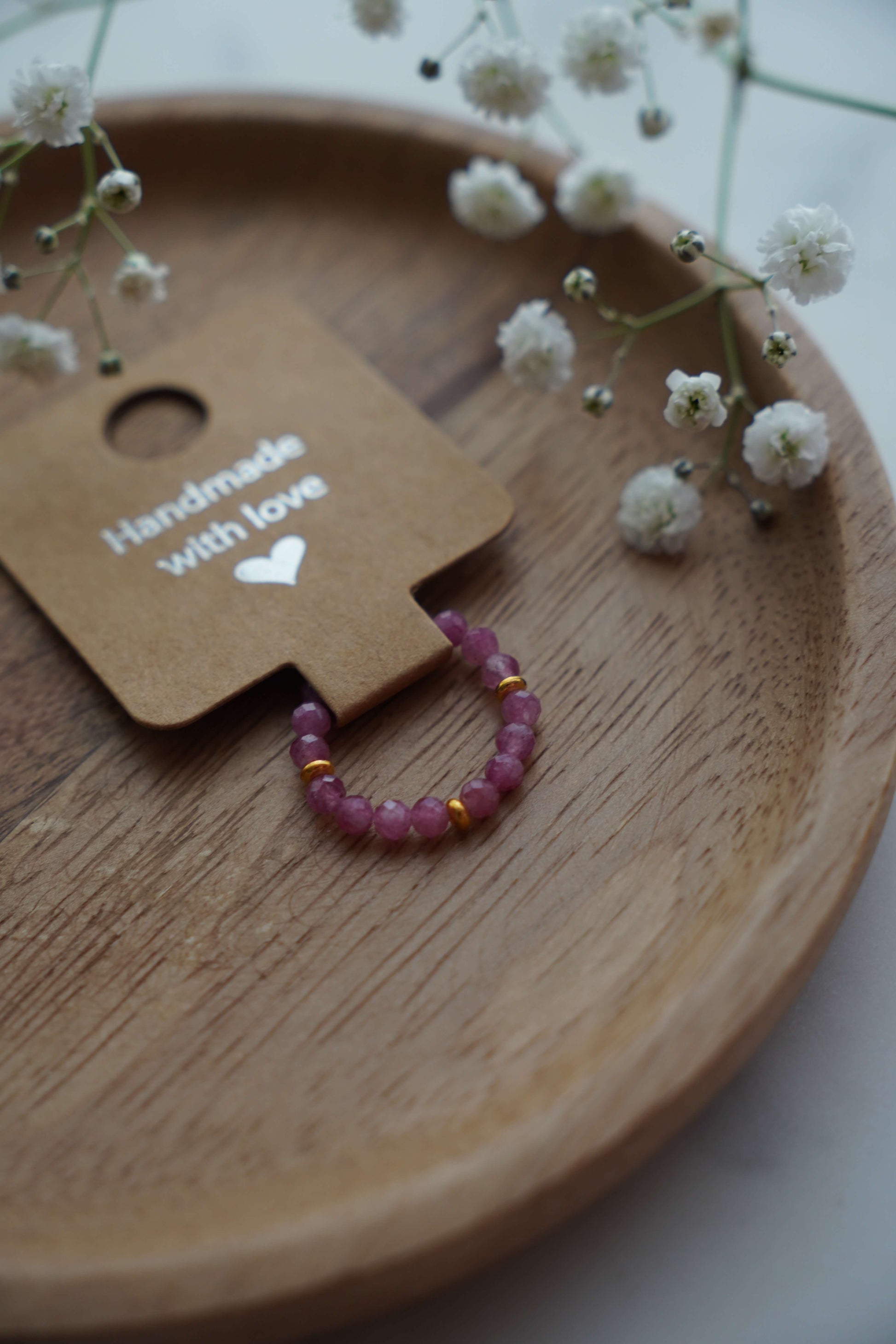 Pierścionek z naturalnego różowego turmalinu, złote akcenty dodają elegancji, a naturalne kamienie czynią go wyjątkowym.