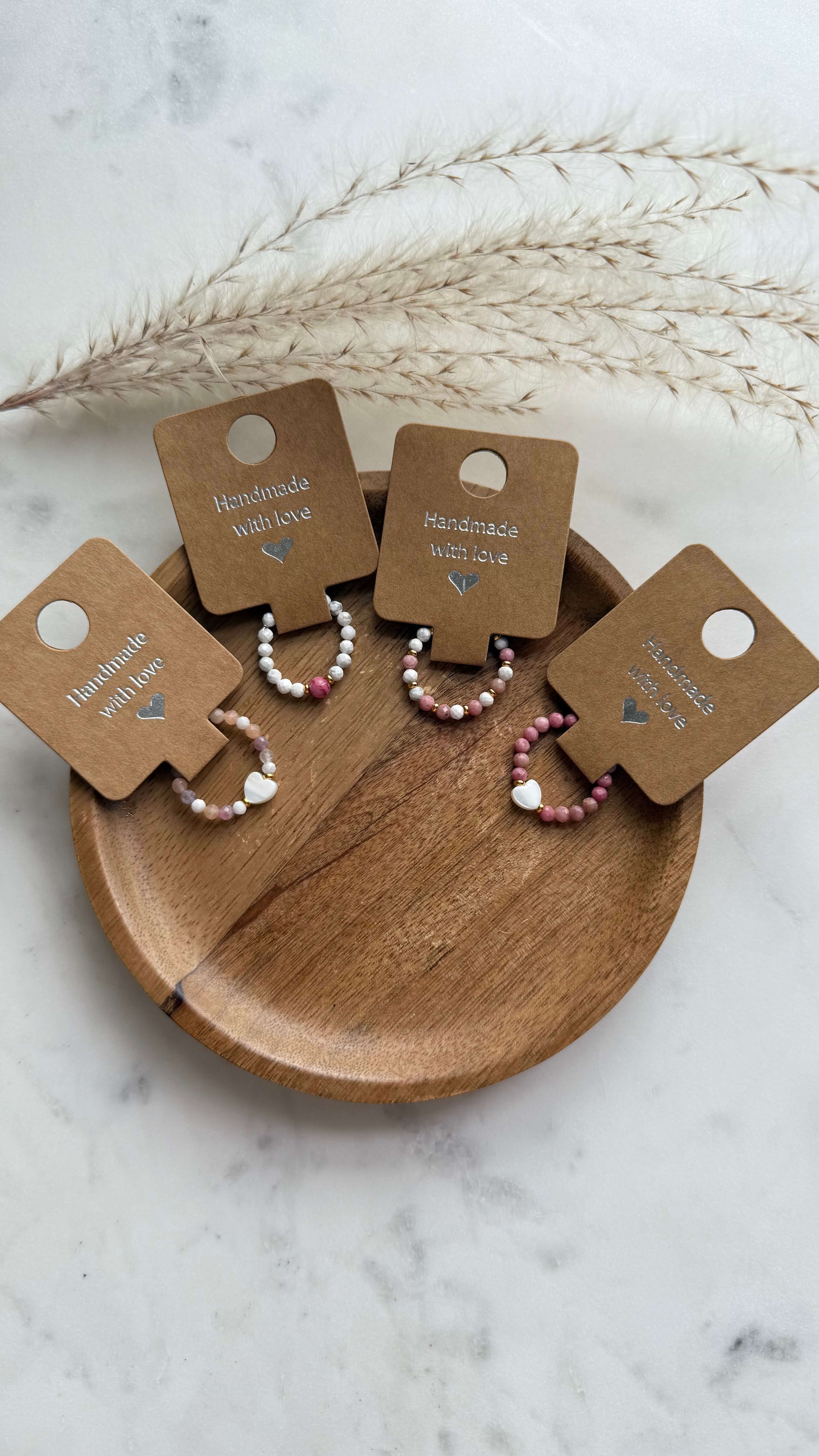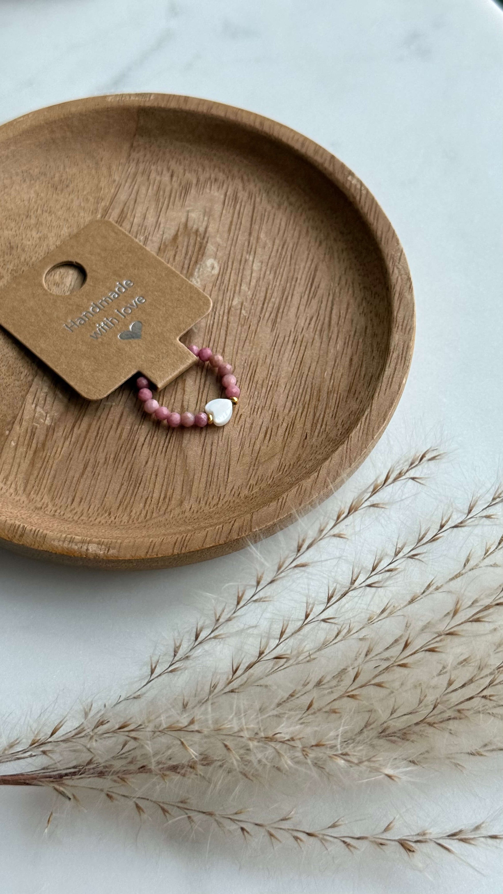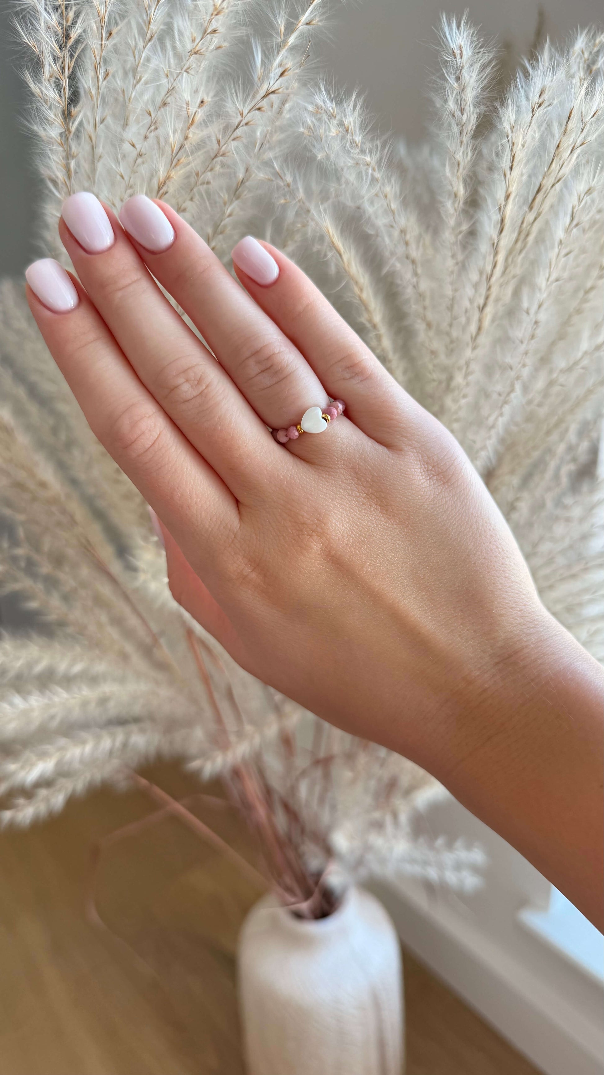 Pierścionek z różowego rodochrozytu, ozdobiony sercem z masy perłowej i delikatnymi przekładkami ze stali nierdzewnej.