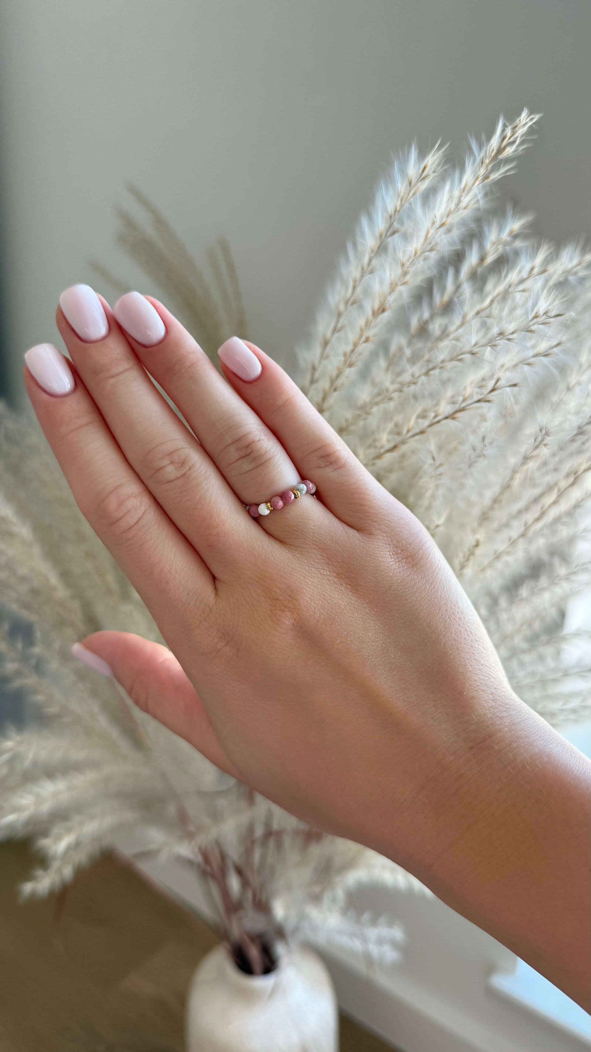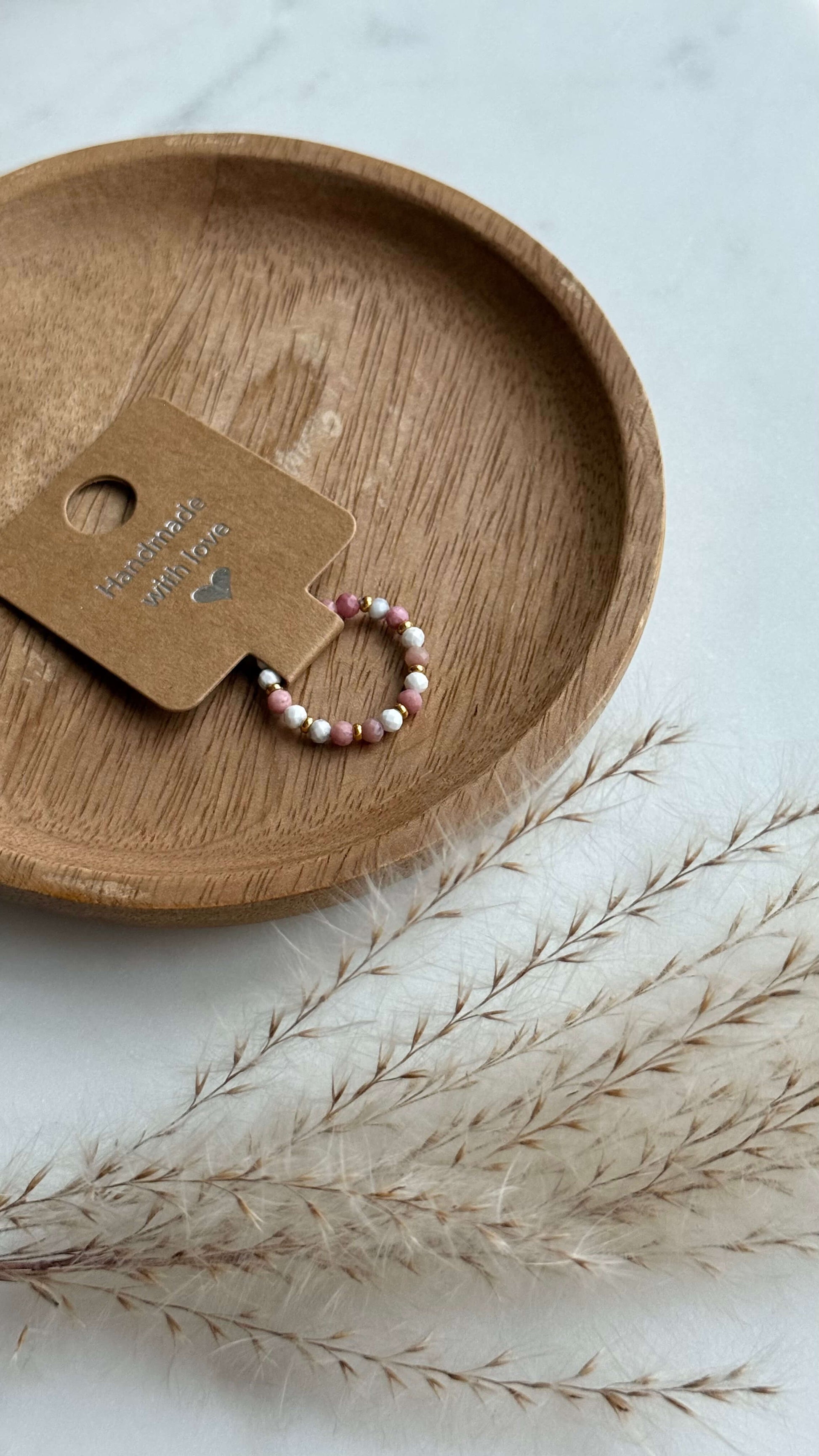 Pierścionek z rodochrozytu – kamienia harmonii, miłości własnej i łagodnego powrotu do równowagi. Jego pudrowo-różowe odcienie w połączeniu z białym howlitem wnoszą spokój, delikatność i kobiecą energię. Całość uzupełniona złotymi przekładkami ze stali nierdzewnej, które dodają szlachetnego blasku.