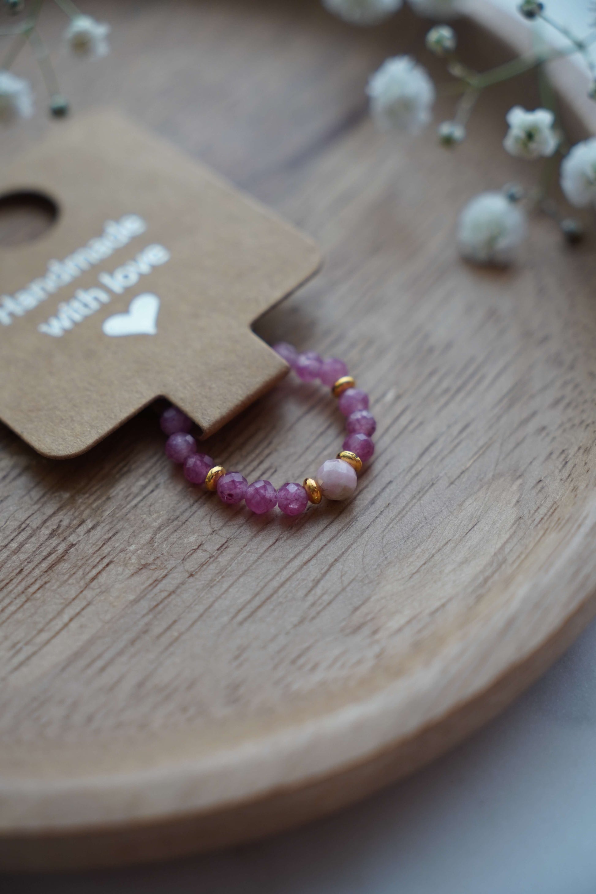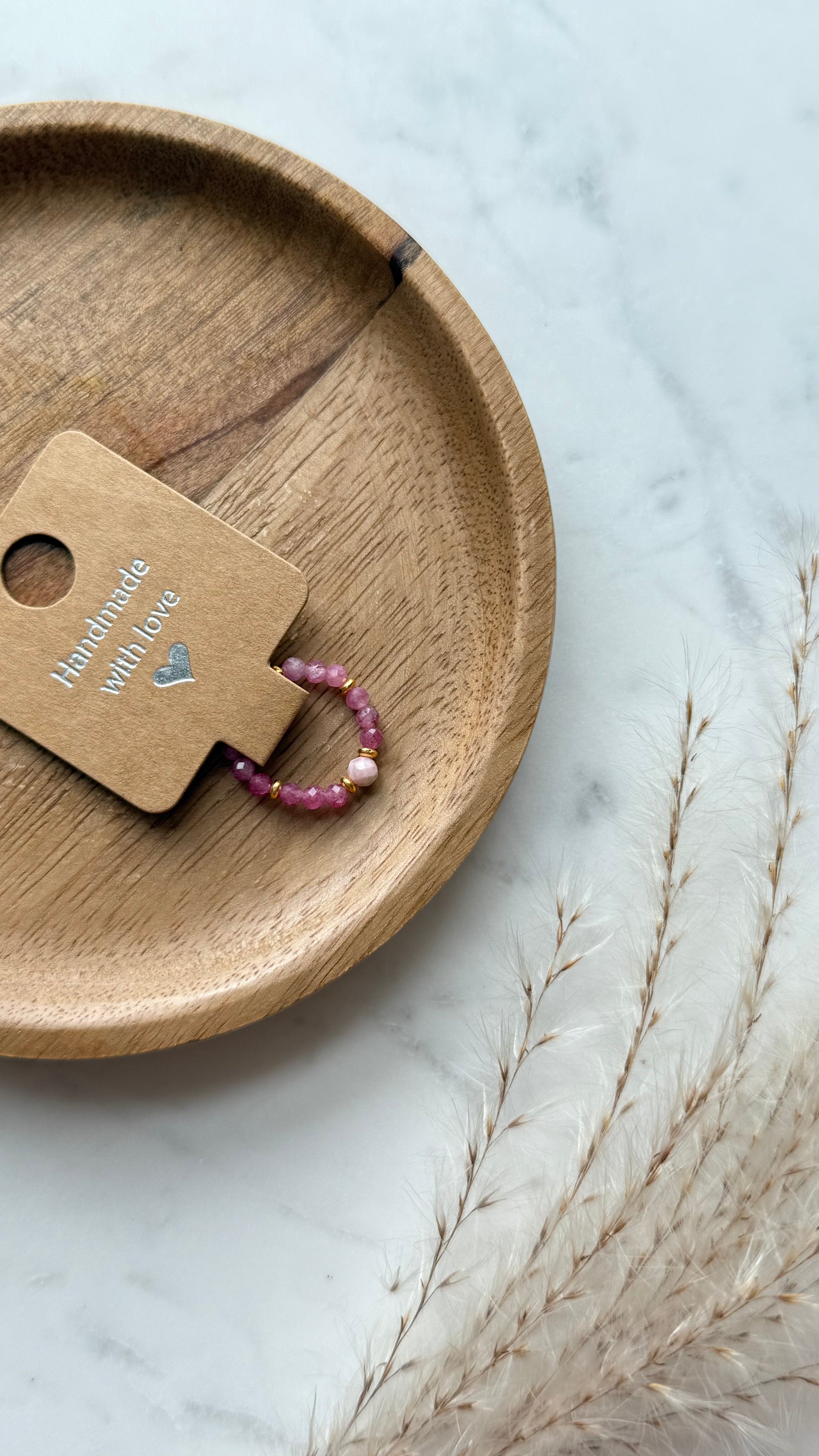 Pierścionek z różowego turmalinu i kamienia opalu, przypomina soczyste, letnie owoce. To biżuteria, która dodaje energii i przypomina o radości z małych rzeczy.